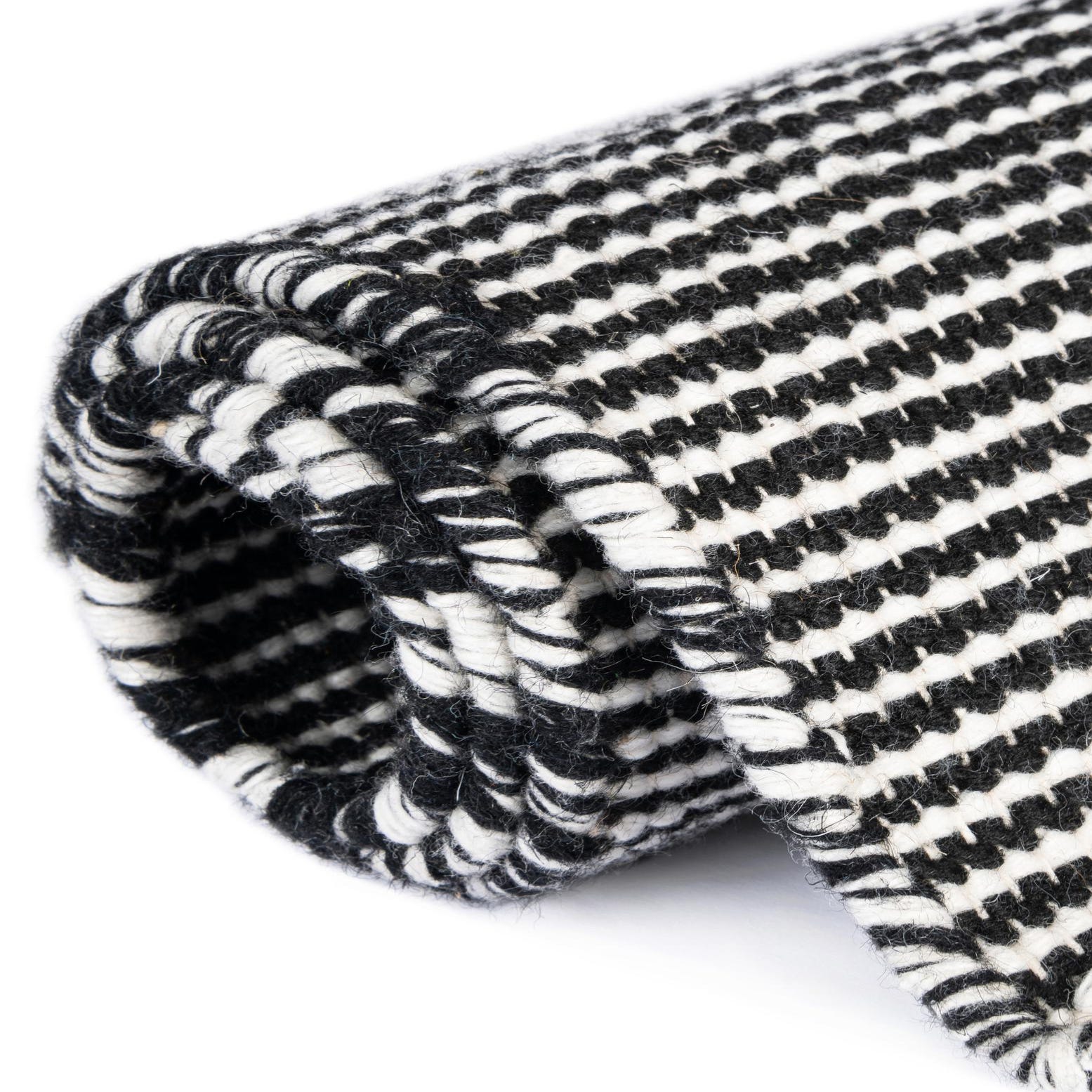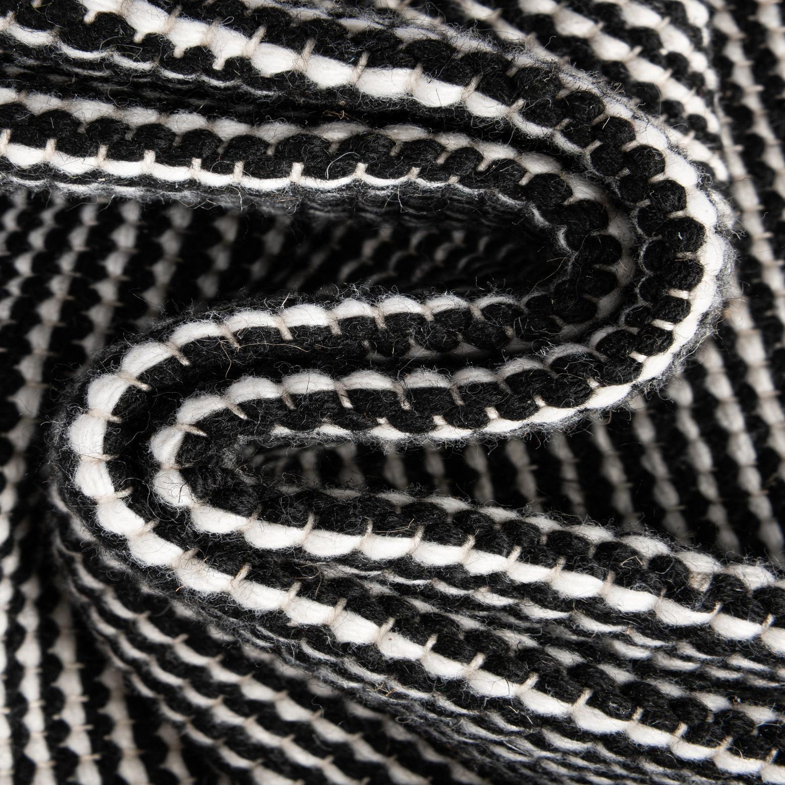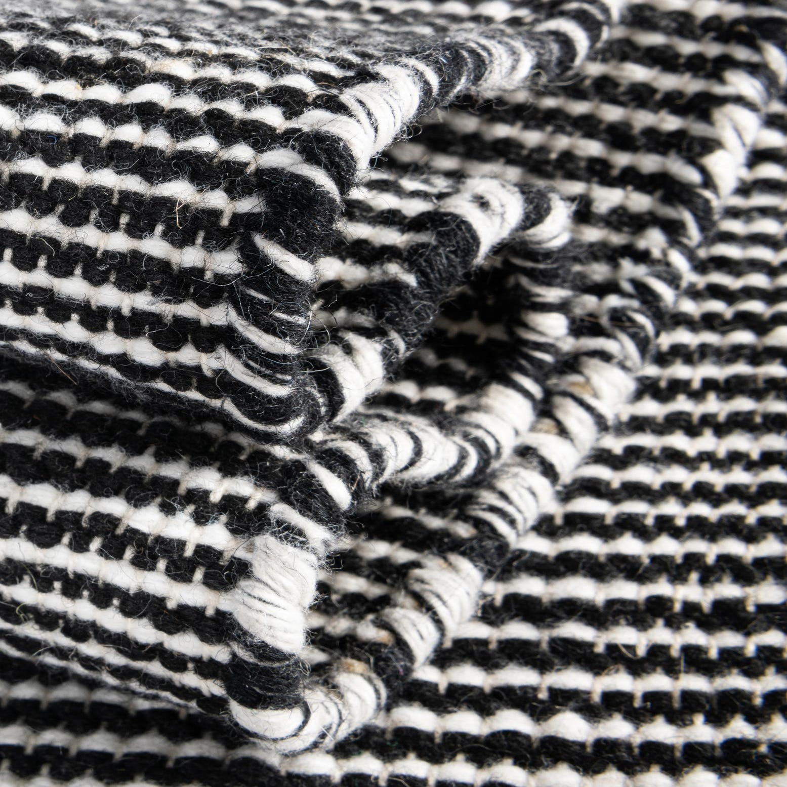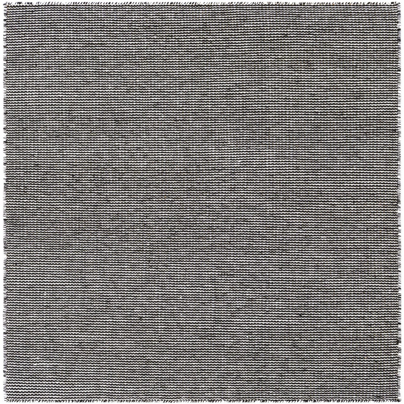 Hand made of 100% PET Polyester (Recycled Plastic Bottles), this flatwoven rug pairs a deep Black Sky field with a tight Ivory micro-stripe pattern. The design is composed of closely spaced, horizontal dashed lines that create a subtle, rhythmic texture across the surface. Low in profile and firm to the touch, the weave offers a crisp, slightly textured hand that holds its structure while adding visual movement to a room.