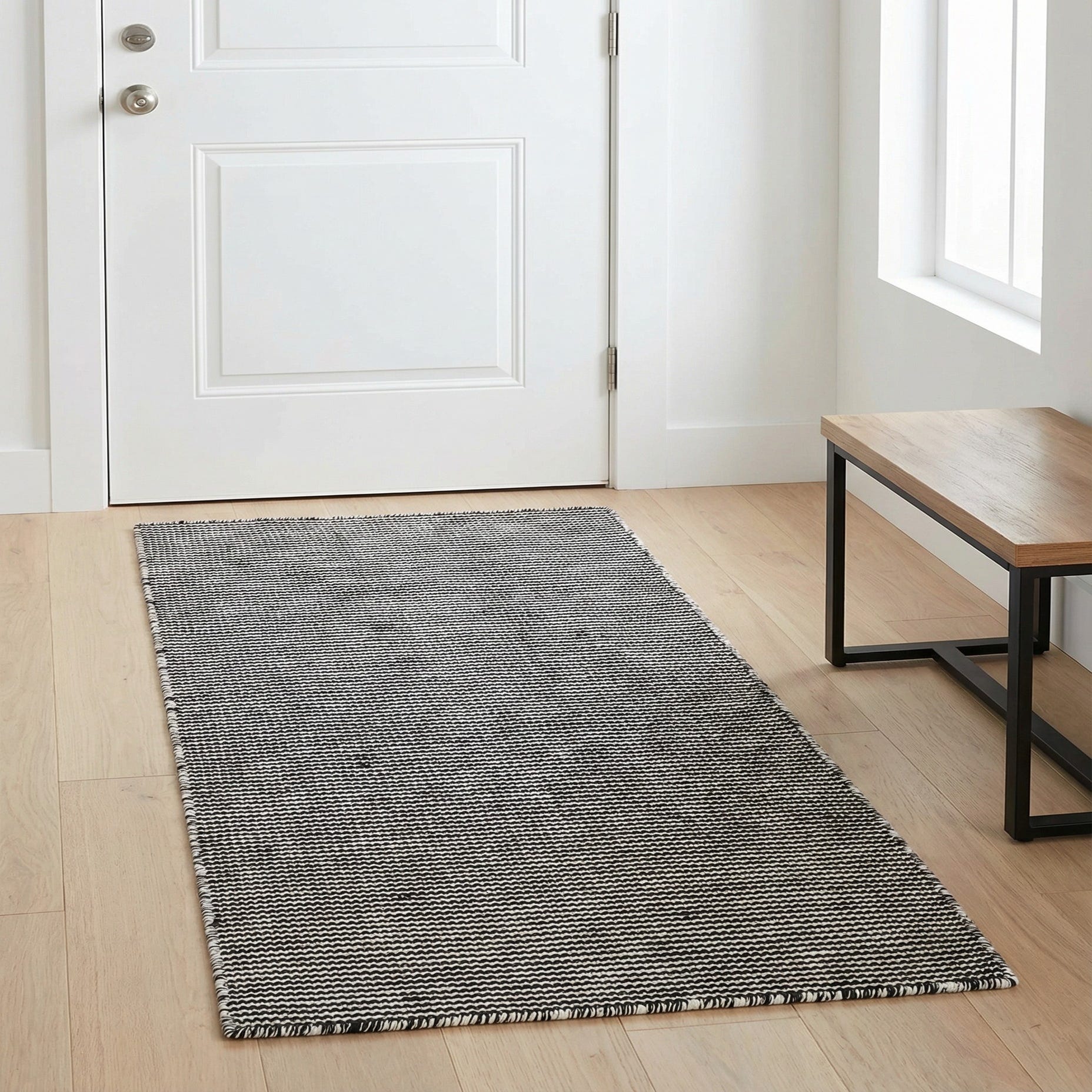 Primary color is Black Sky. Colors in this rug include: Black Sky, Ivory.
