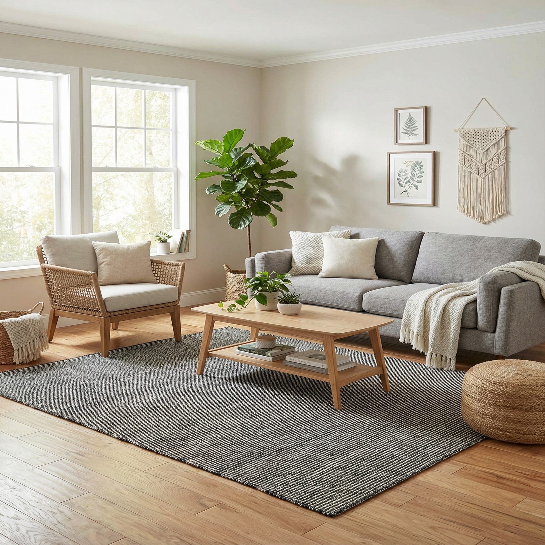 This rug works well on a covered patio or balcony as a grounding layer for rattan or teak seating, and it complements modern outdoor furniture with metal frames and neutral cushions. Indoors, place it in a sunroom, mudroom, or under a small bistro set to add graphic contrast to natural woods and light upholstery; it also layers nicely over a larger neutral rug to introduce texture and subtle pattern.