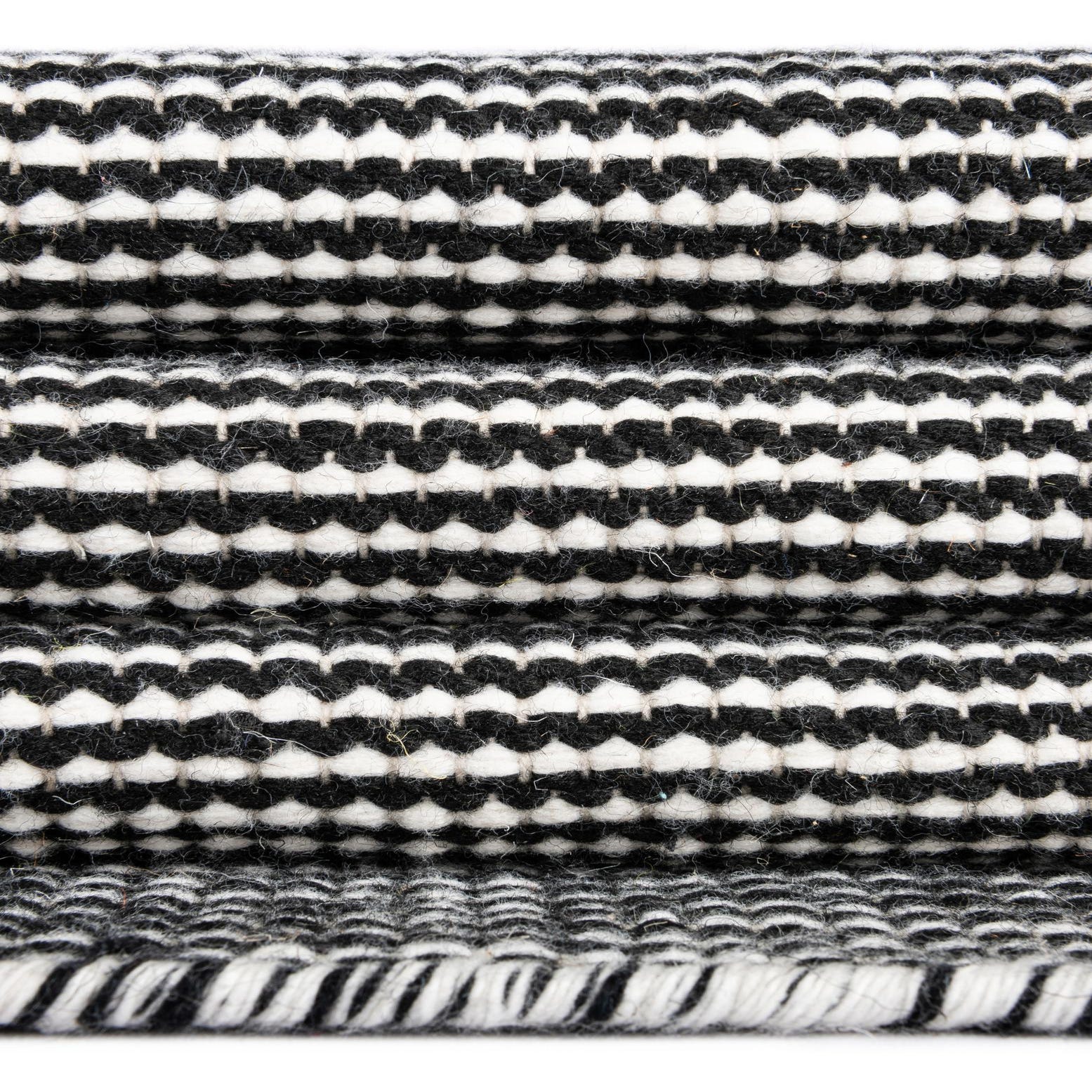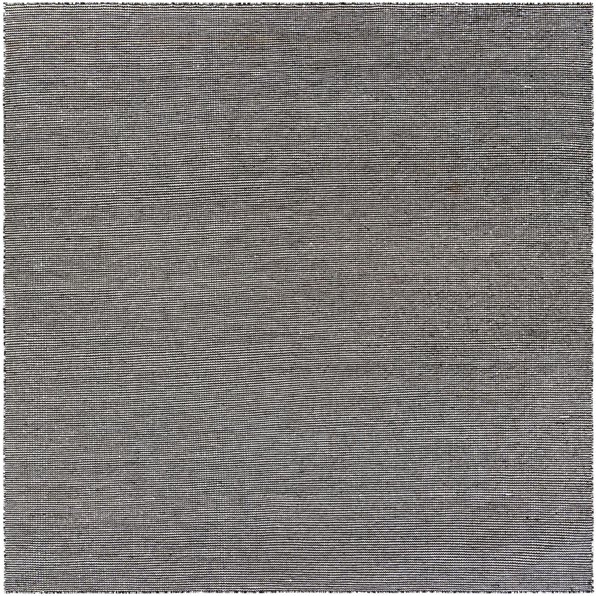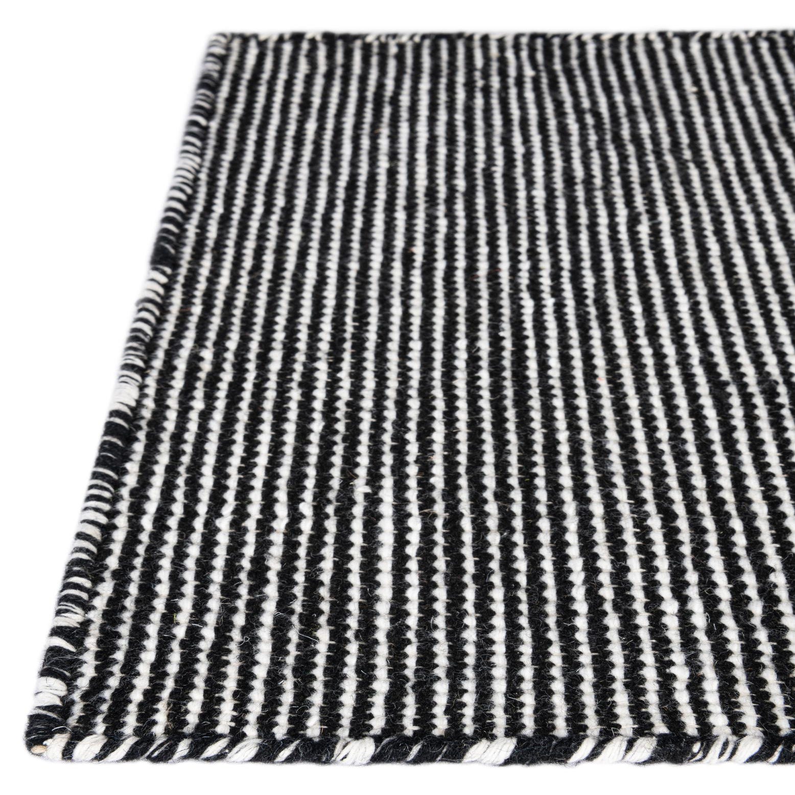 A refined, low-profile flatweave in a Black Sky ground woven with fine Ivory micro-stripes, this rug offers a calm, textural presence without a bold motif. The hand-made construction in 100% PET polyester (recycled plastic bottles) produces a tightly woven surface that feels firm and slightly textured underfoot, with the Ivory threads catching light against the deep Black Sky base for subtle visual depth.