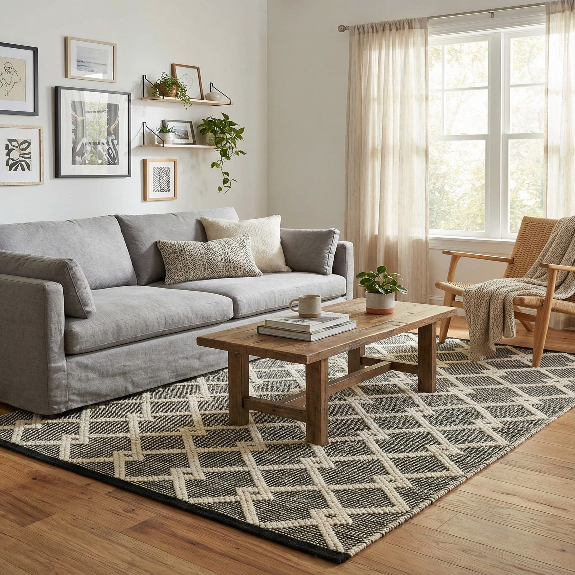 This rug complements contemporary, transitional, and modern farmhouse schemes. Use it to anchor a compact seating area with light upholstery, add graphic contrast in an entryway against wood floors, or define a small dining nook beneath a round table. It pairs well with warm wood finishes and brass accents for a refined modern look, or with linen fabrics and painted furniture for a softer, layered palette.