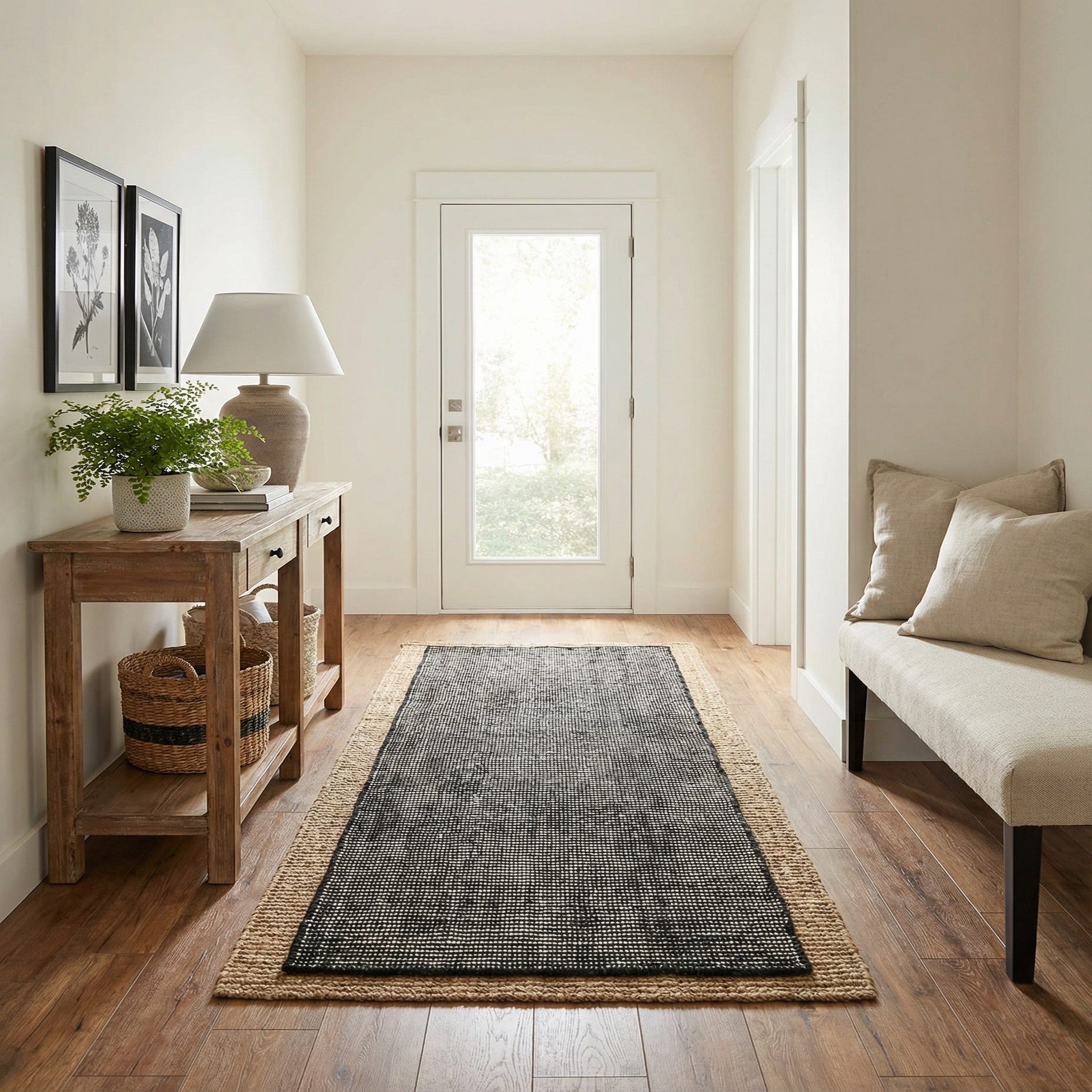 Designed as a runner, this piece anchors narrow spaces like hallways and entryways or alongside a kitchen island. The dark background is ideal for grounding light wood floors and pale walls, while the ivory detailing pairs well with brass or matte black accents, leather seating, or linen upholstery. Its clean, understated pattern suits contemporary, transitional, or modern farmhouse interiors that favor layered neutrals and tactile materials.