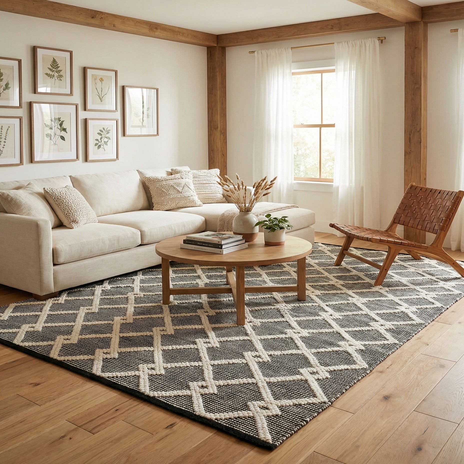 A 5x8 rectangular black and off-white modern rug with a repeating geometric diamond pattern, suitable for a living room.