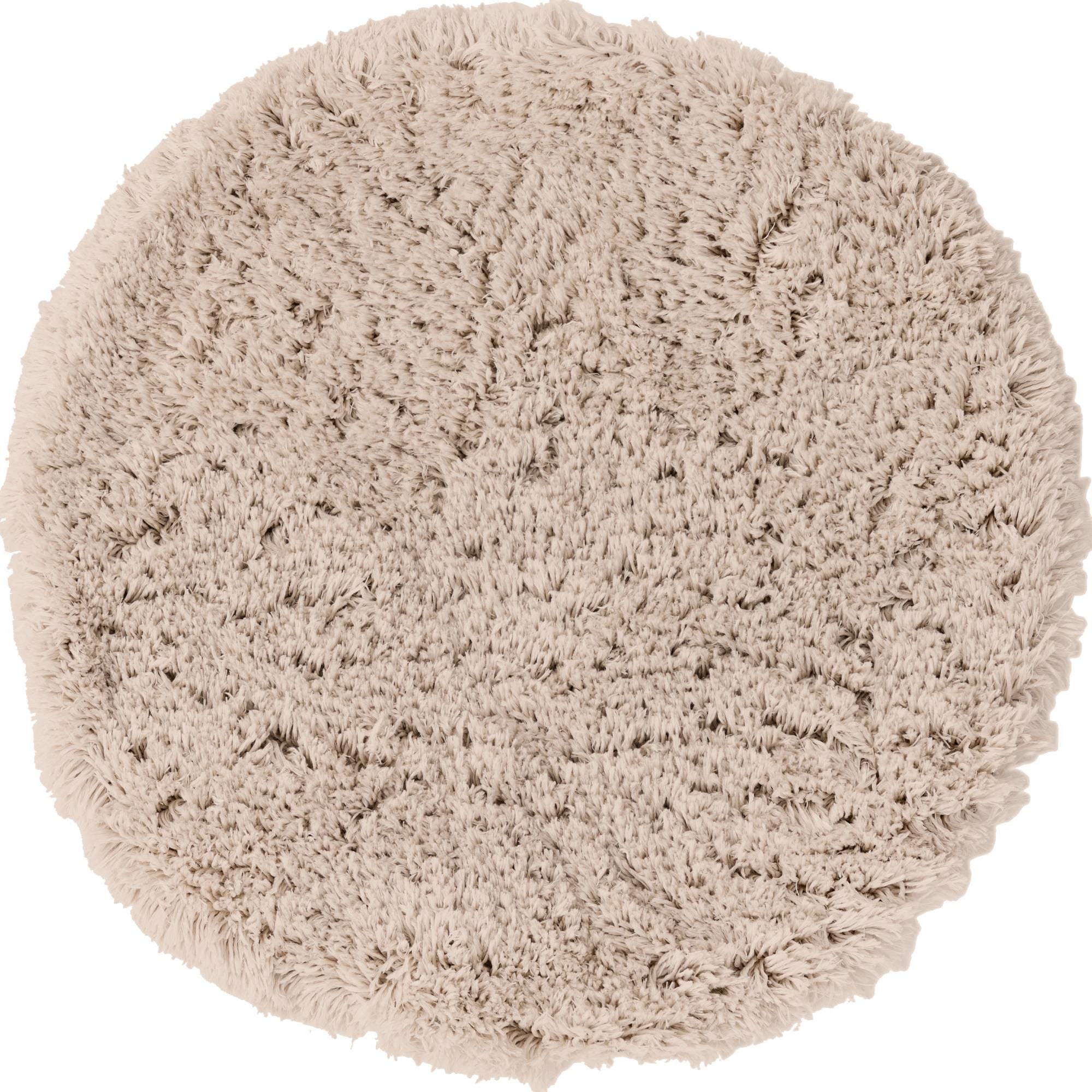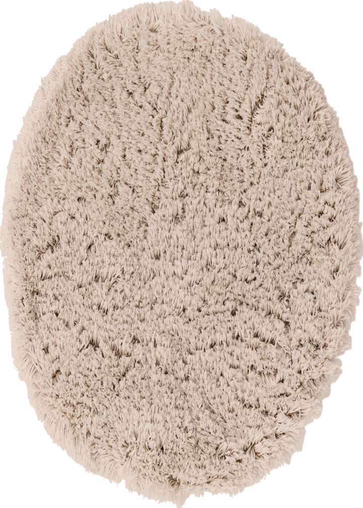 A plush, round shag rug in a warm ivory and tan blend, showcasing its soft, textured pile.