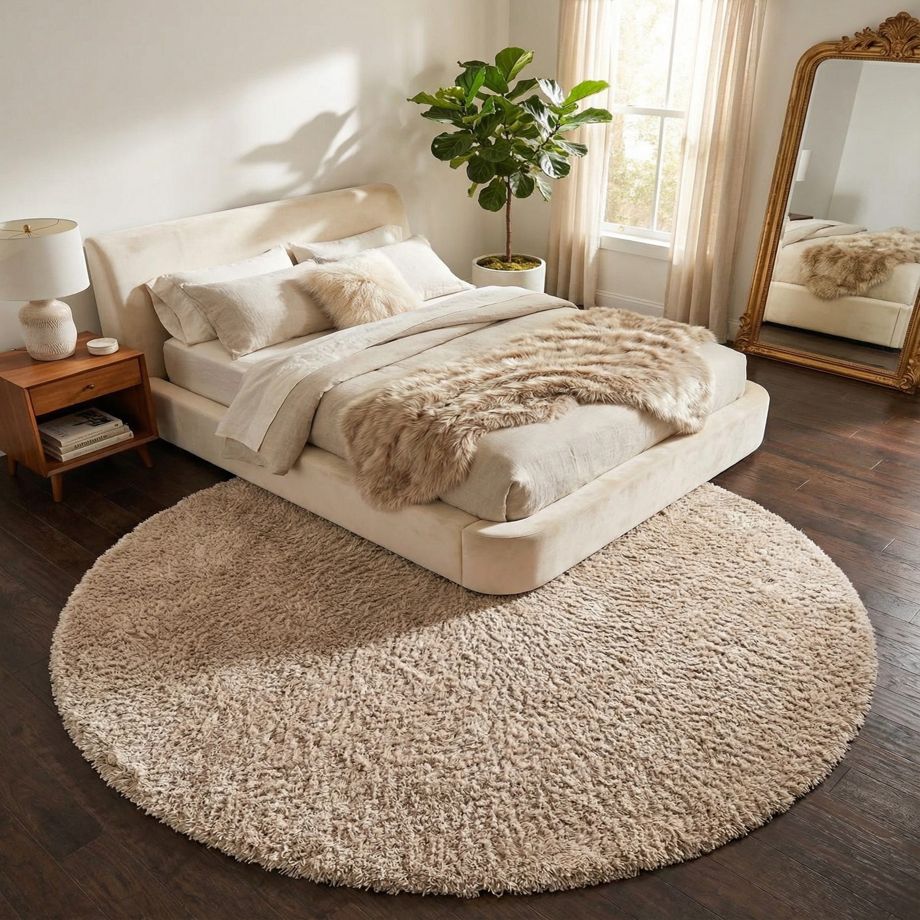 This rug works well in bedrooms, a cozy reading corner, or as a soft anchor beneath a small seating group or round coffee table. It pairs naturally with Scandinavian or modern transitional schemes, coastal palettes, and layered bohemian interiors — especially alongside natural woods, woven textures, and muted accent colors where a tactile, neutral foundation is needed.