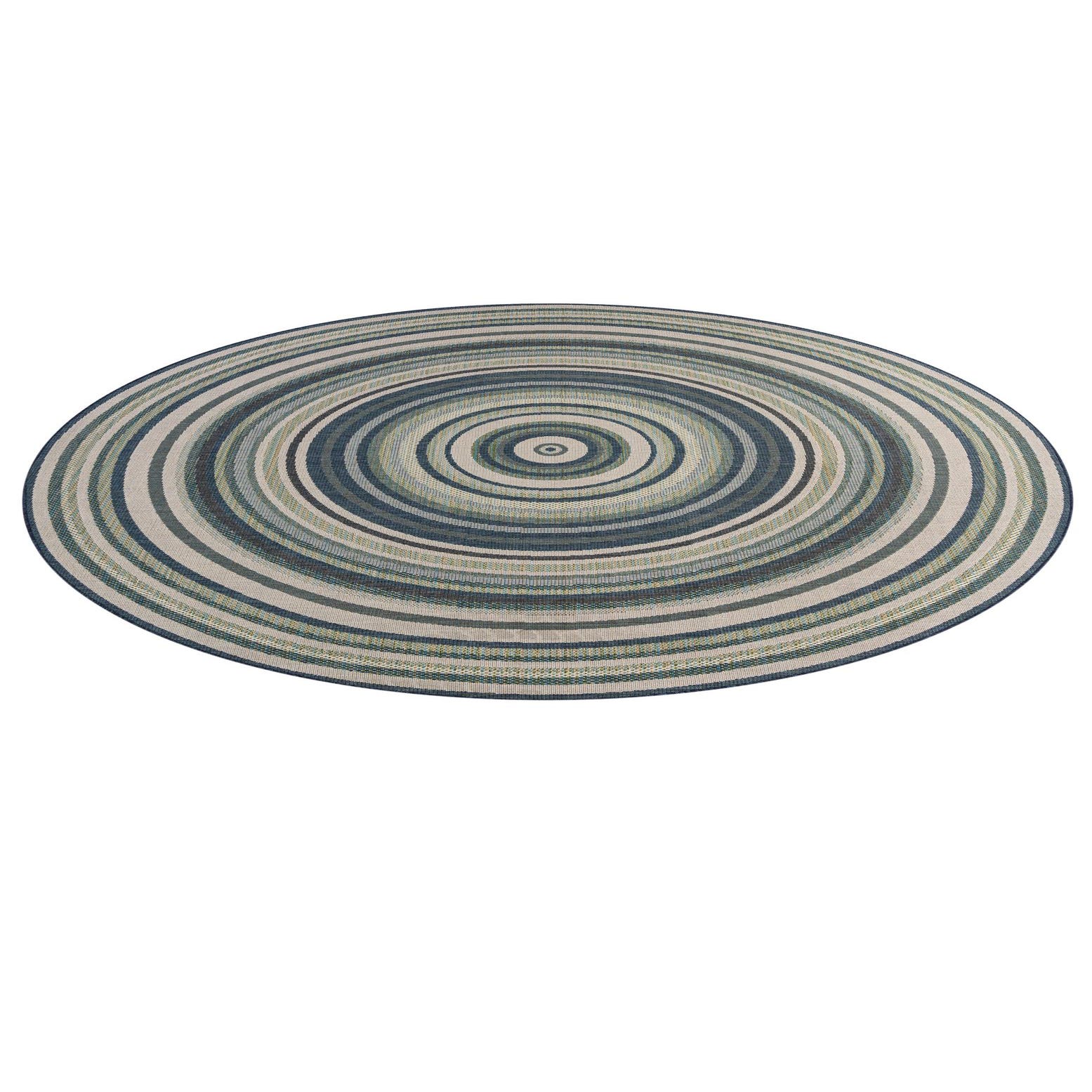 A 10-foot round Baja Outdoor rug with concentric blue, green, and beige stripes, ideal for a patio.