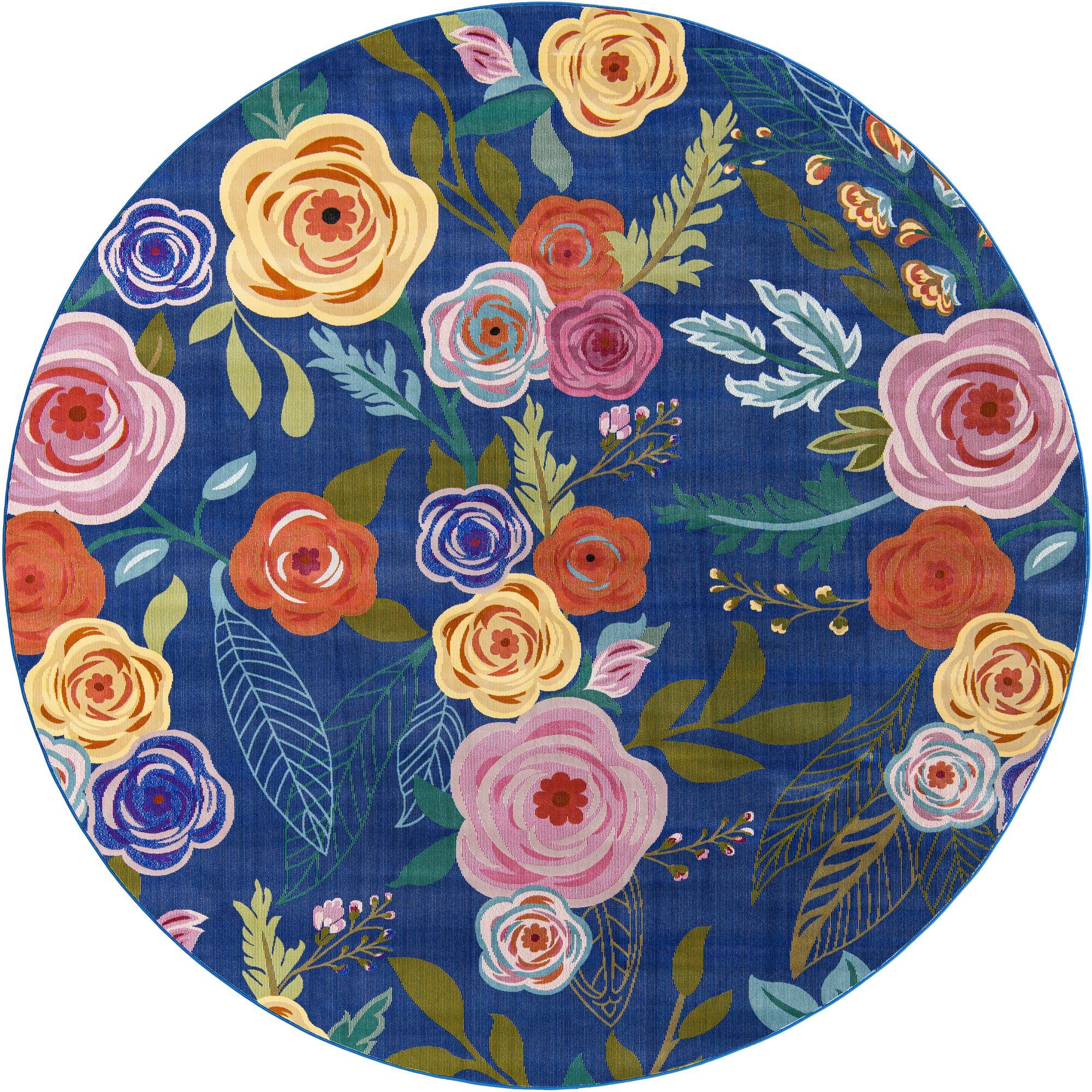 This round piece anchors spaces that benefit from a strong focal point: place it beneath a round dining table, center it in a living area to add color against neutral sofas, or use it in a sunroom or bedroom to introduce a cheerful, layered palette. It pairs well with midcentury wood tones, painted cottage furnishings, or eclectic bohemian textiles, and the rich blue ground brings cohesion to coastal-inspired or contemporary interiors.