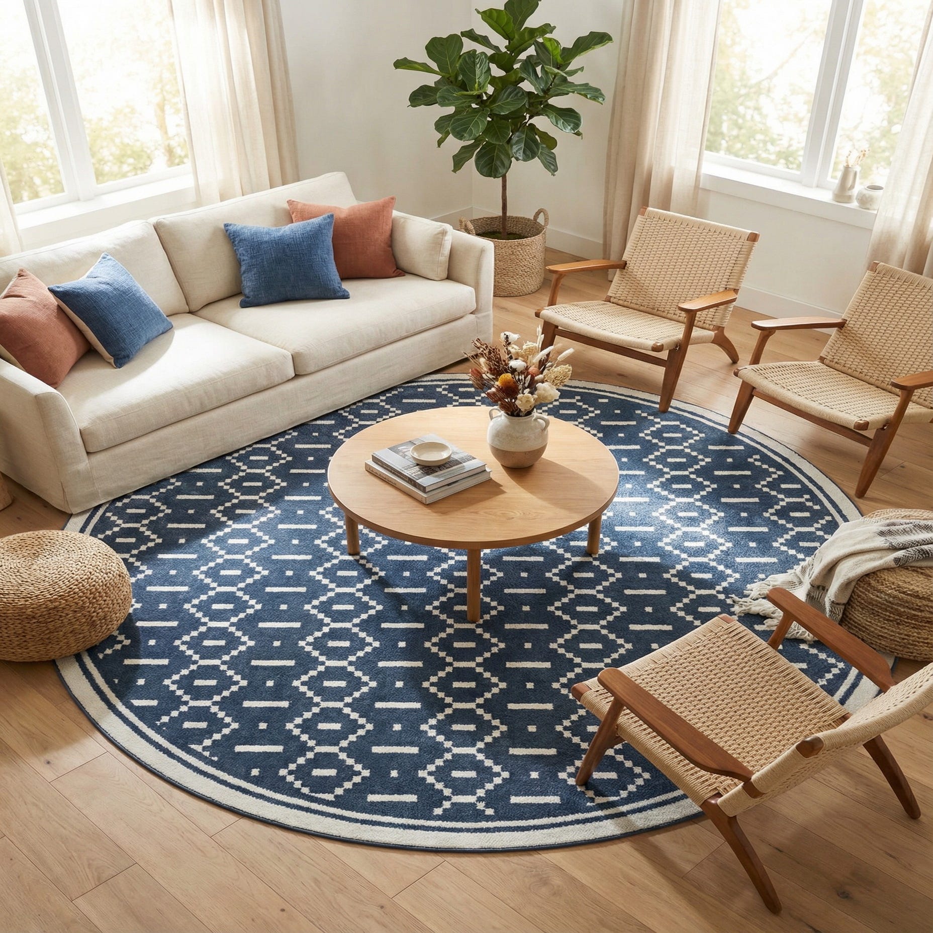 This round rug will complement an array of interior designs, from modern minimalist to more eclectic spaces that play with patterns and color. The neutrality of the ivory combined with the depth of the blue allows for pairing with a wide spectrum of color palettes, including, but not limited to, monochrome schemes, pastel accents, or even bold hues for a striking contrast. Ideal placements may include, but are not limited to, living rooms beneath a coffee table, in dining areas, or within open-plan spaces to define a particular zone. The round shape adds a soft, organic touch to square or rectangular rooms, balancing straight lines and angles present in typical furniture arrangements.