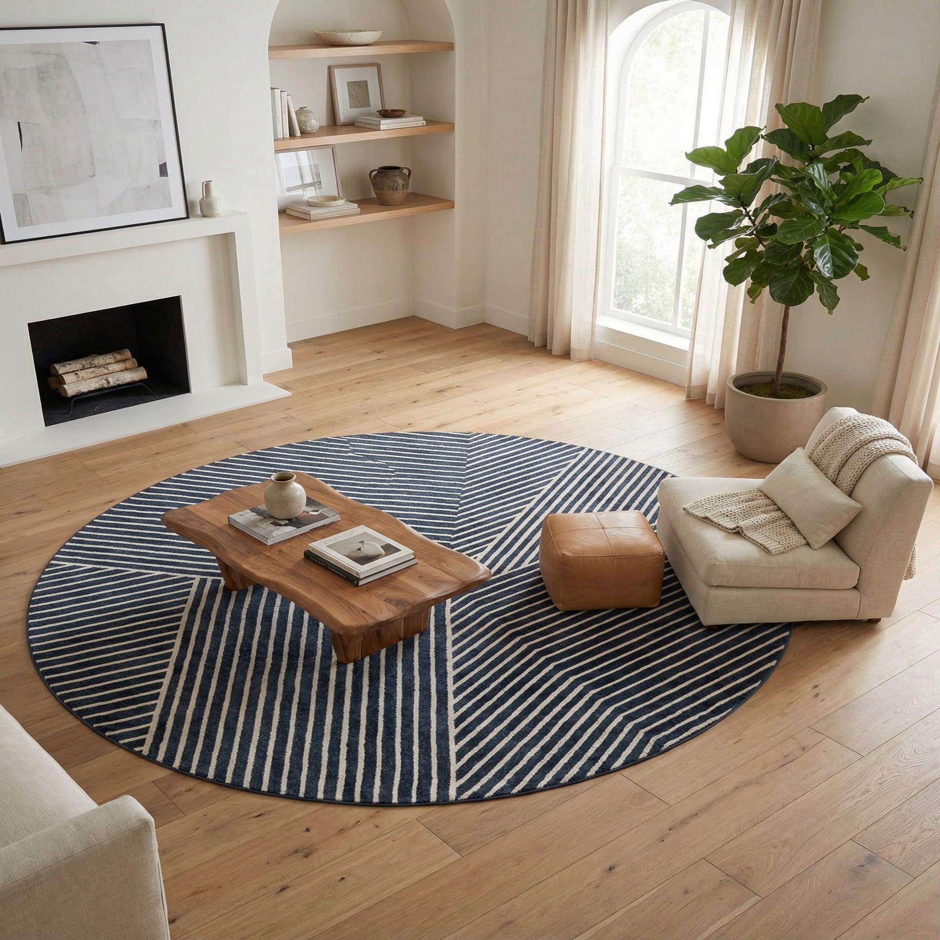 The contemporary design of this rug makes it an ideal choice for a variety of interior design scenarios. Its round shape and striking pattern can serve as a focal point in a living room, under a round dining table, or in a spacious entryway, adding both style and comfort to modern, minimalist, or coastal-inspired decors. The color palette would complement interiors featuring cool tones or serve as an artistic statement amongst neutral furnishings.