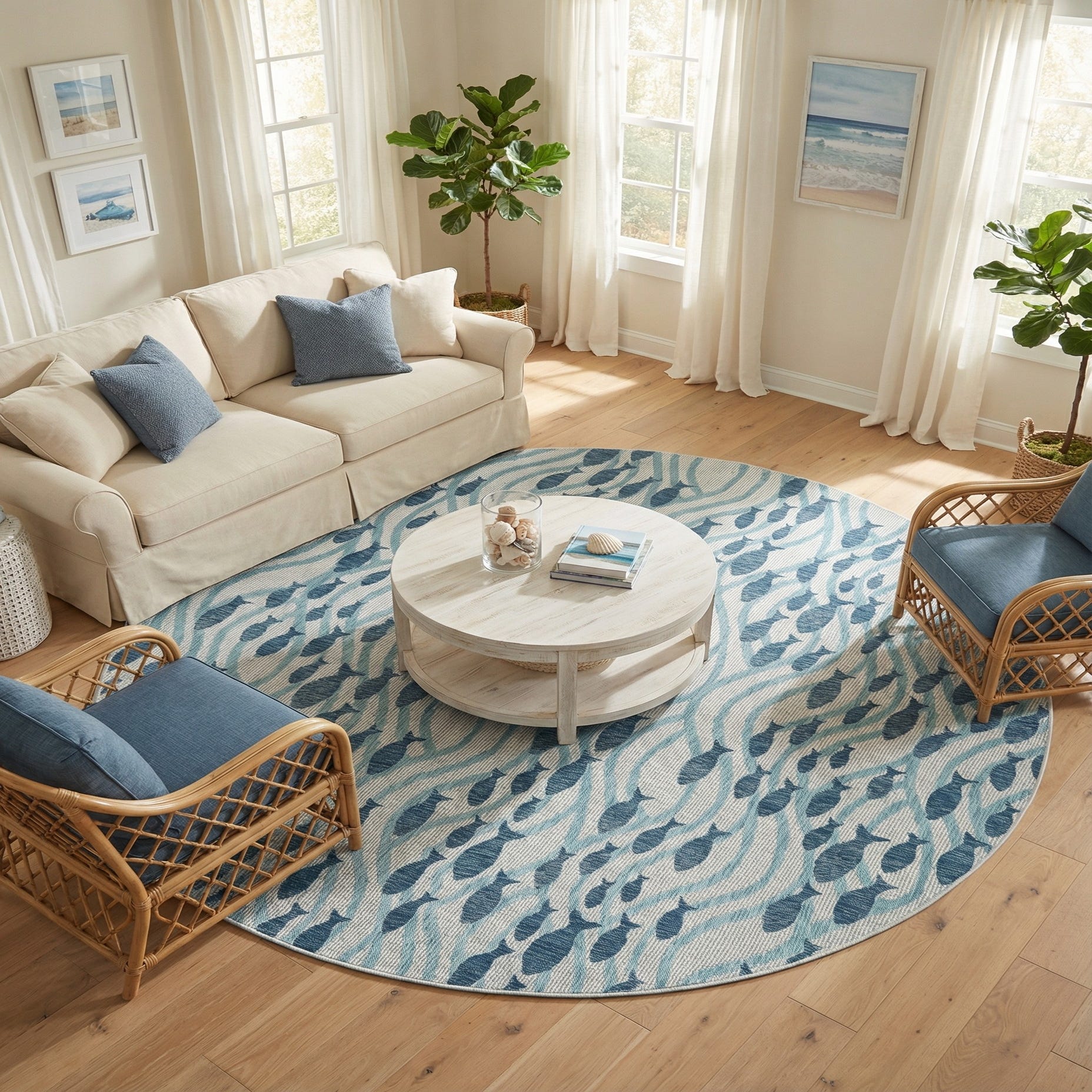 This round piece works well on a covered patio or sunroom to tie together wicker seating and whitewashed wood, or as an anchor for a coastal living room with linen upholstery and driftwood accents. It also layers nicely beneath a round bistro table or brightens an entryway or beach house bedroom where a casual maritime vibe is desired.