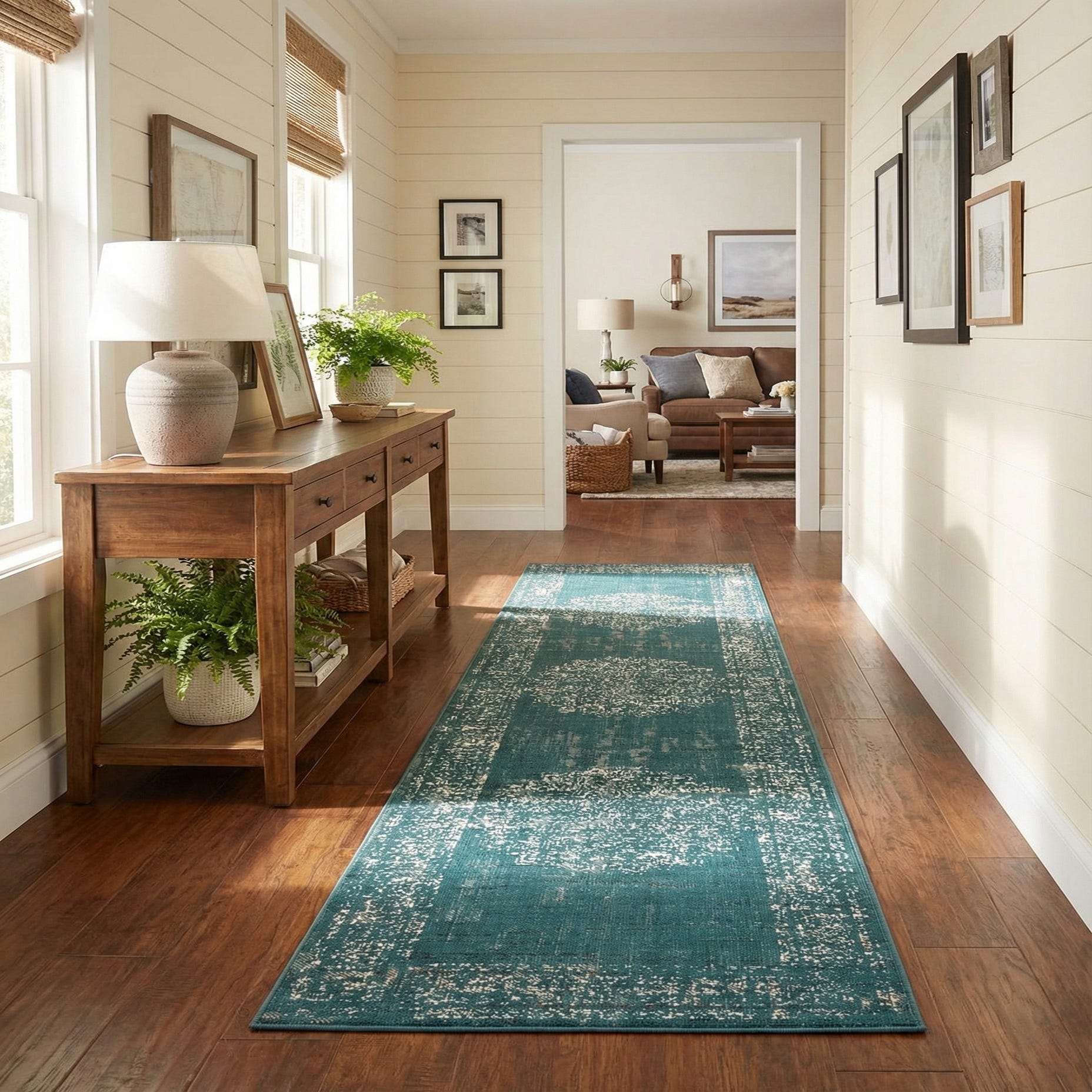 This runner works well in hallways, entryways, or alongside a bed to add a pop of color without overwhelming the room. It pairs nicely with light or natural wood floors and white trim for a coastal or modern farmhouse feel, and it also complements charcoal or navy upholstery and brass or matte-black accents in more contemporary or transitional interiors. Layer with neutral textiles and simple accessories to let the blue-and-ivory palette stand out.