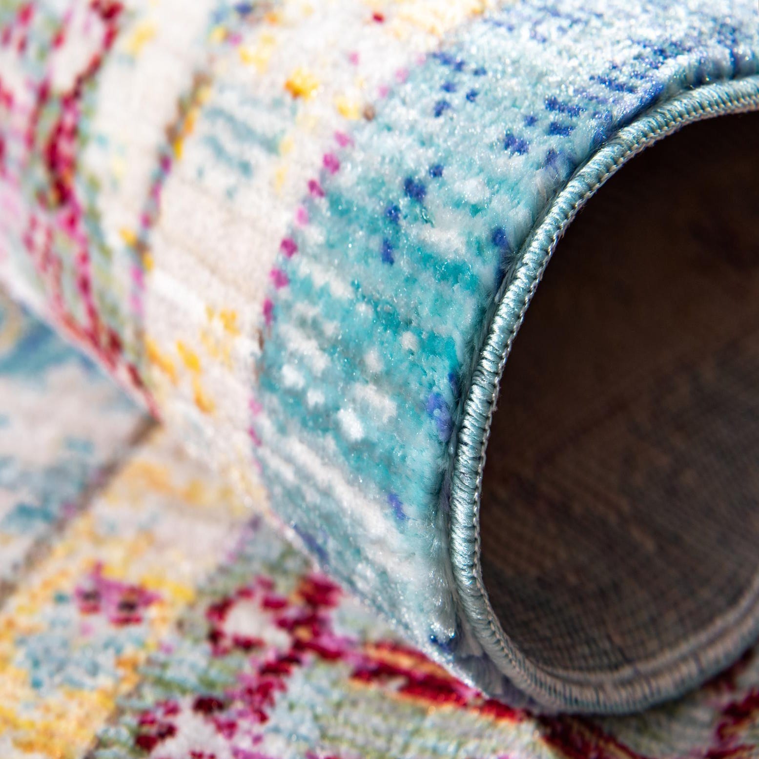 A 10 ft runner rug in shades of blue, red, and yellow with a distressed Bohemian medallion and botanical pattern, perfect for a hallway.
