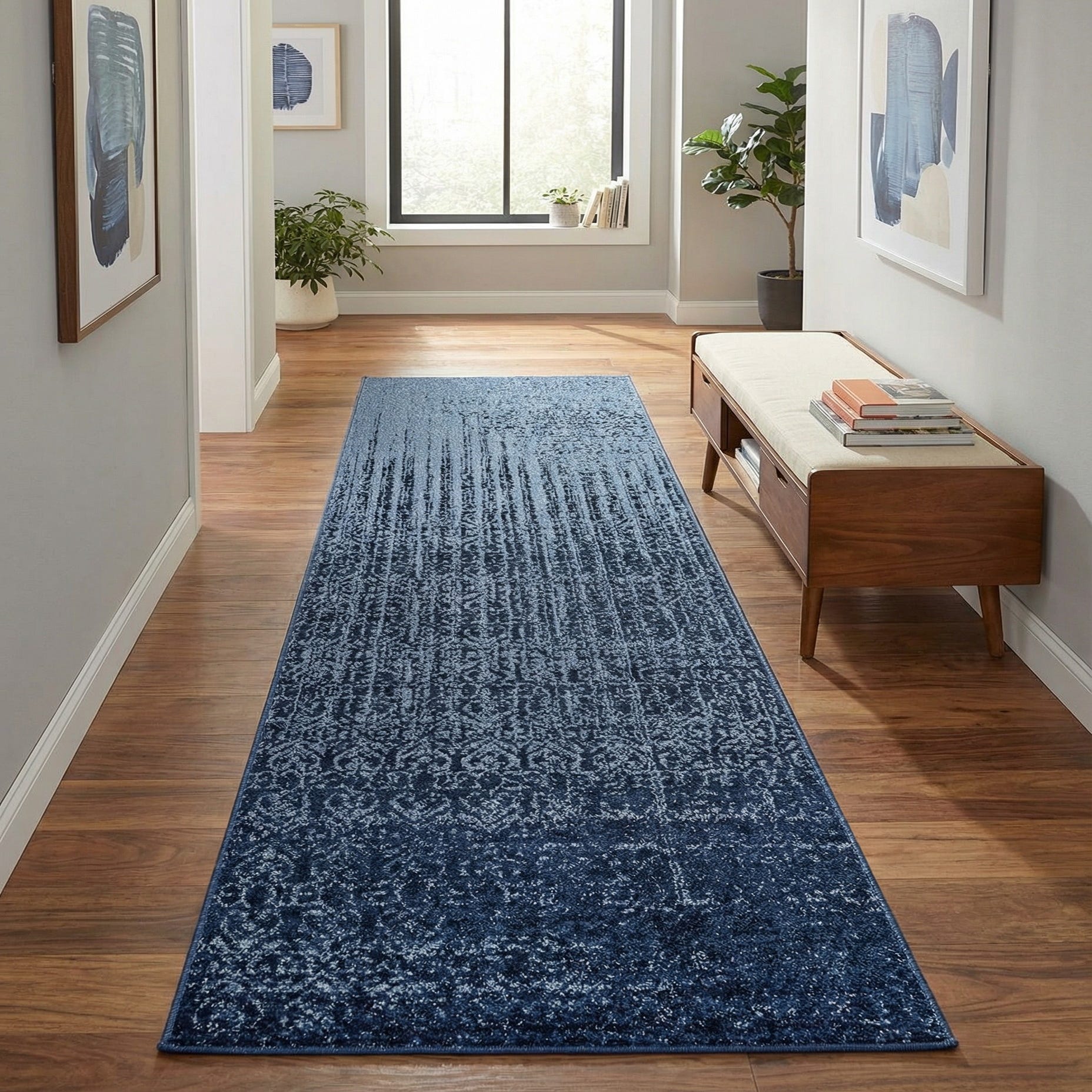 The Angelica 10 Ft Runner offers a modern touch with its dynamic pattern and a duo-tone color palette. This rug features a distressed abstract design in varying shades of blue, set against a deep blue background, creating depth and visual interest. Machine-woven from 100% polypropylene, it provides both durability and a soft texture, making it an ideal choice for high-traffic areas.