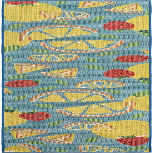 The Baja Outdoor 10 Ft Runner celebrates a vibrant medley of fruit-inspired motifs set against a deep blue background. This rug inherently brightens an outdoor or indoor space with its playful pattern composed of stylized citrus fruit slices and whole fruits depicted in a lively palette including green, ivory, red, yellow, and orange. The flatweave construction reinforces the design's graphic clarity, ensuring that each shape is crisp and well-defined.