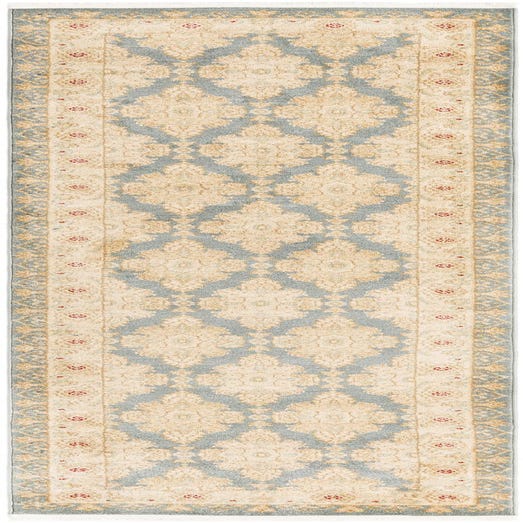 Primary color is Blue. Colors in this rug include: Blue, Beige, Cream, Light Blue, Light Brown, Light Green, Red.