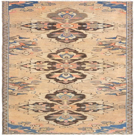 A 10 ft Hamedan runner rug with a traditional tribal pattern in blues, browns, and peach on a beige background, perfect for a hallway.