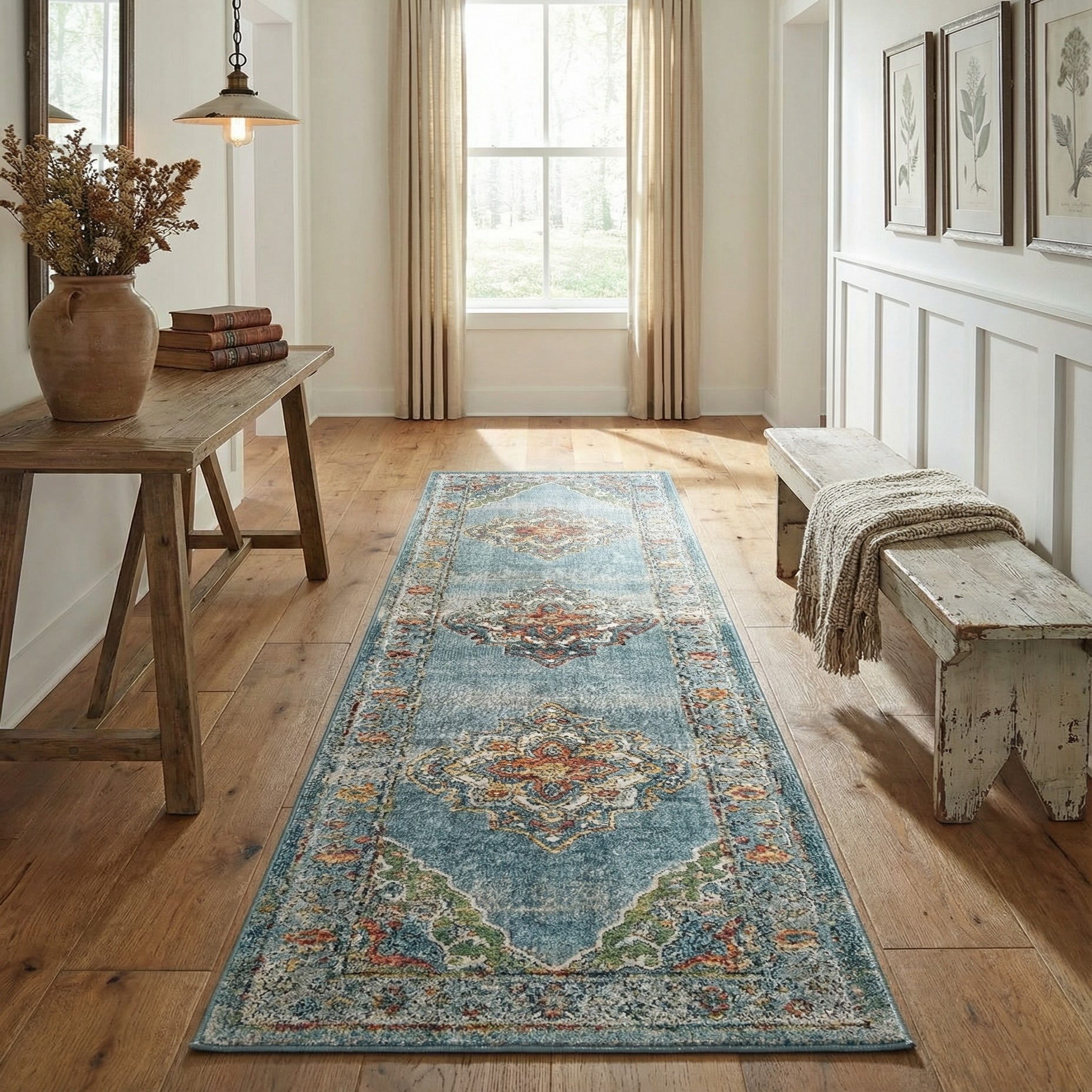 Use this runner to anchor a hallway, entryway, or narrow kitchen where pattern and color can guide circulation; it also layers well at the foot of a bed or down a gallery-style corridor. The color mix pairs easily with warm wood tones, painted white trim, and mixed-metal hardware, and complements transitional, cottage, bohemian, or eclectic interiors that blend classic motifs with relaxed, lived-in texture.