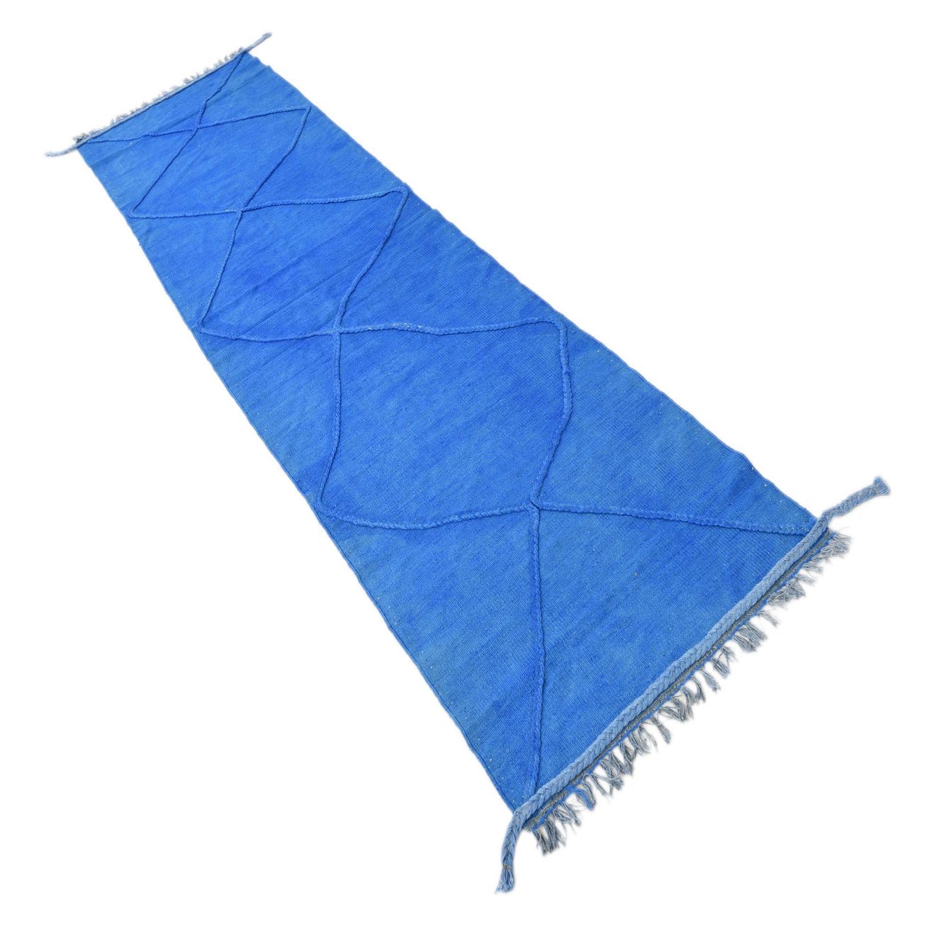 Thanks to its bold blue hue and minimalist design, this runner seamlessly integrates with a range of interior styles from modern to bohemian, Scandinavian, or coastal. It serves as a strong foundational piece that can anchor a room's aesthetic or complement paired decors with similar palettes or understated designs. The Kilim Modern runner is a versatile choice for adding warmth, texture, and contemporary style to any interior space.