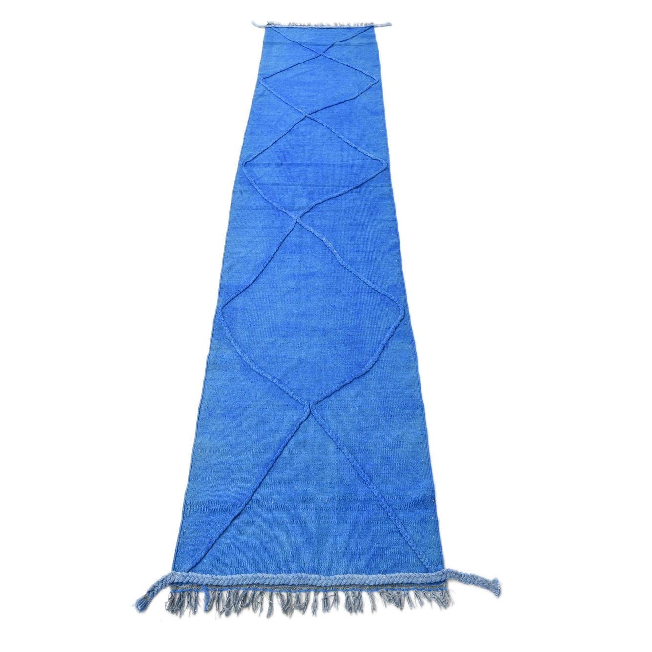 The Kilim Modern collection presents a hand-woven 10 Ft runner crafted from 100% wool, boasting durability and a tactile texture. This piece features a vivid blue background with a simple yet dynamic geometric pattern, lending it a contemporary edge. The design incorporates crisp lines to form a series of elongated diamond shapes that bring visual interest and movement to the rug's surface.