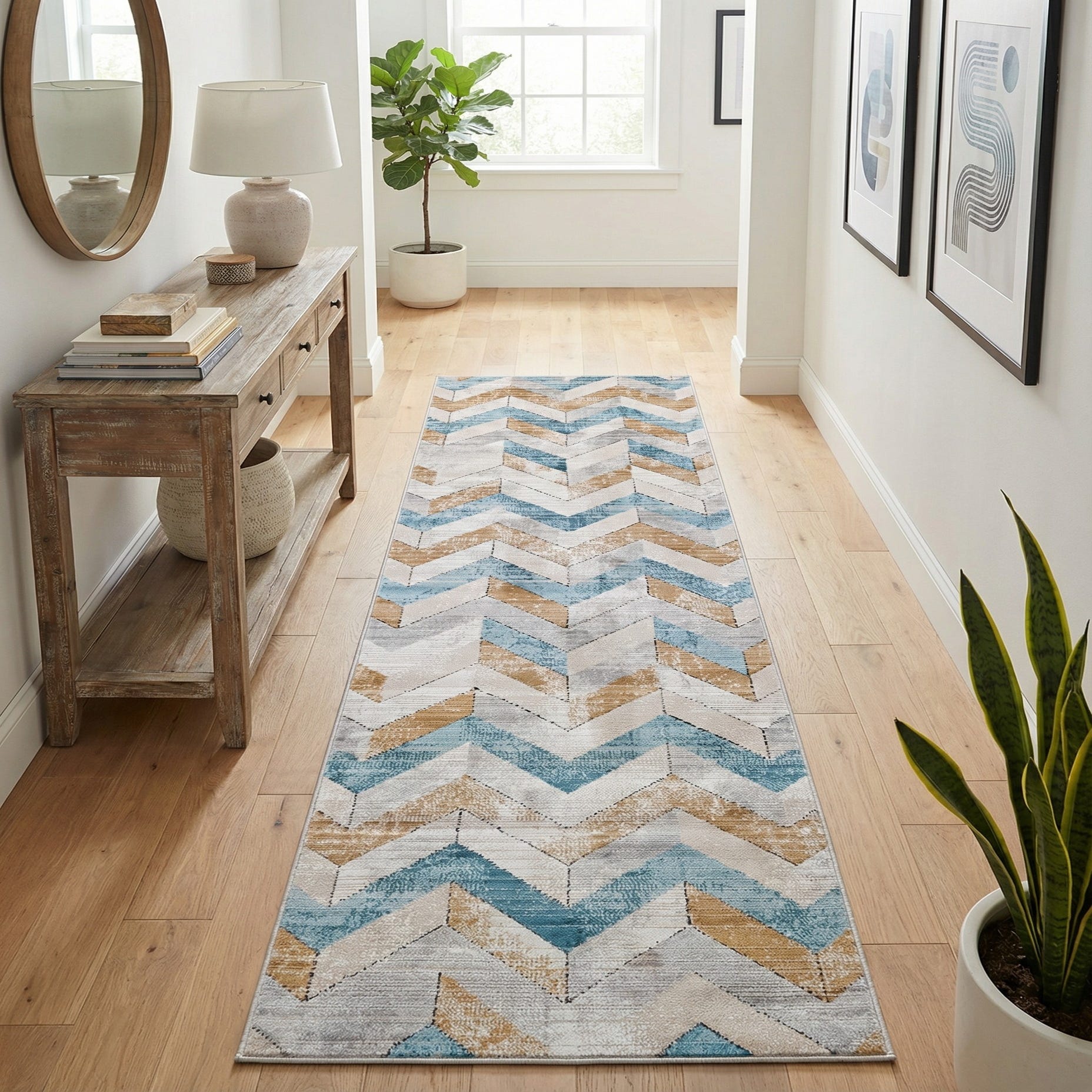 Chevron bands move across a blue background in a pattern that balances geometric rhythm with a lived-in, painterly finish. Ivory, light blue, gray and light brown chevrons alternate in a distressed, layered motif that creates visual depth without busying a narrow space. The surface shows subtle pile variation and a soft sheen from the fibers, giving the design a tactile quality you can feel underfoot.
