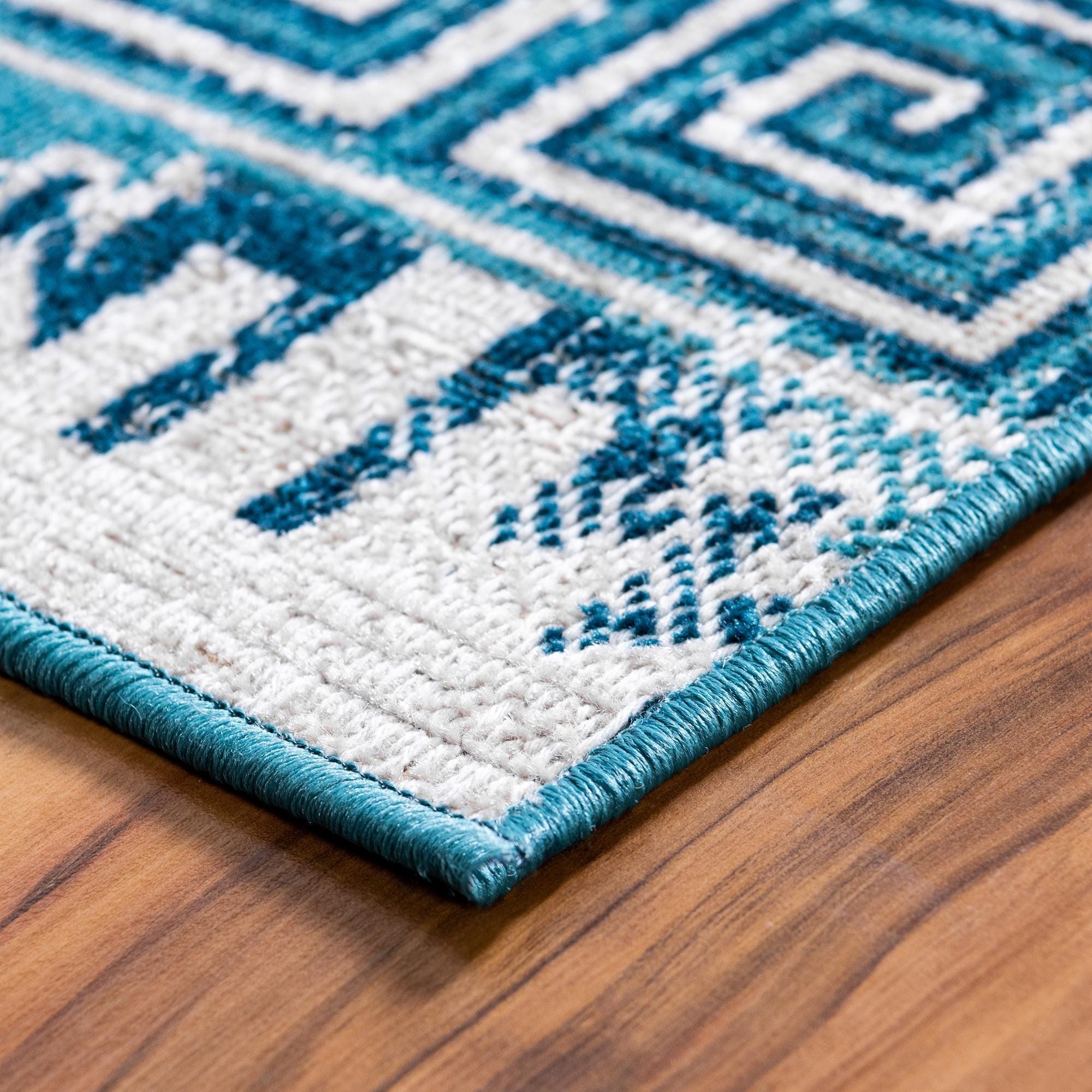 A banded, tribal-inspired pattern runs the length of this runner, alternating Greek-key meanders, diamond lozenges, chevrons and small medallion rows for a layered, rhythmic look. The blue background anchors the design while navy blue, ivory and gray provide contrast and visual depth. The surface is machine-made from 100% polypropylene with a low, dense pile that feels smoothly cushioned underfoot and carries a gently distressed finish that gives the pattern a lived-in character without heavy texture.