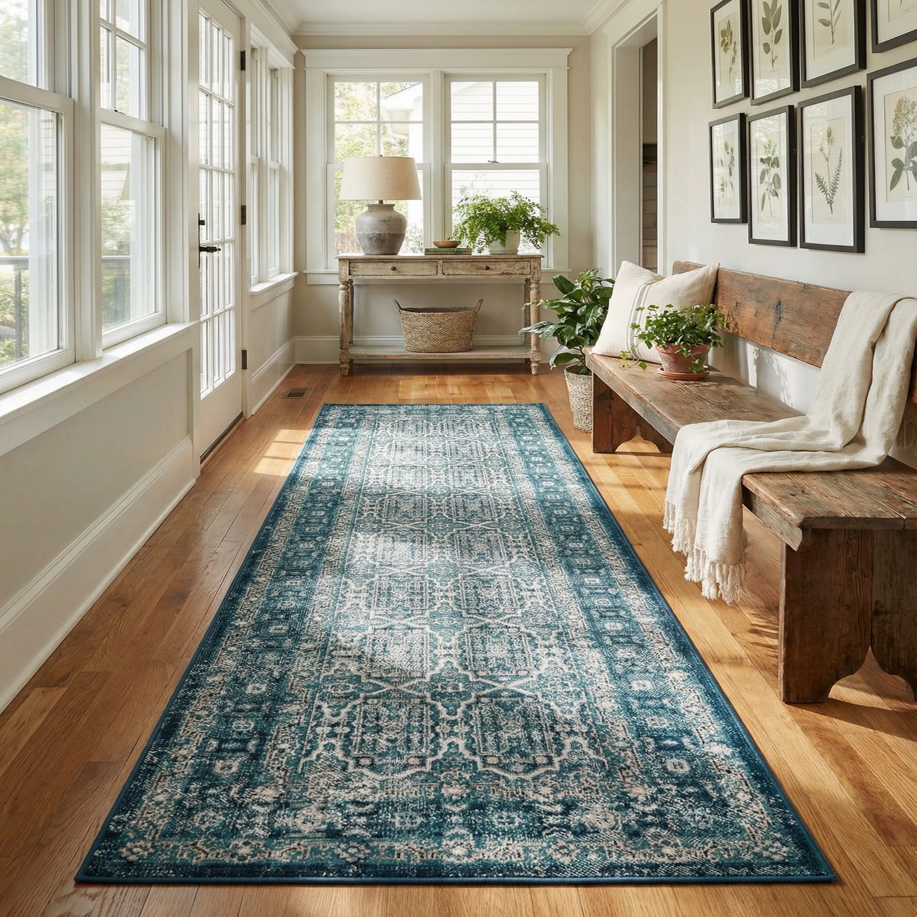 Sized and shaped as a runner, this piece works well in entryways, hallways, stair landings and alongside beds or kitchen islands. Pair it with warm wood floors and neutral furnishings for a classic feel, or layer it with linen upholstery and pale paint for a coastal or transitional palette. It also complements navy or slate-gray accents and looks intentional under a narrow console table or in a long, open corridor.