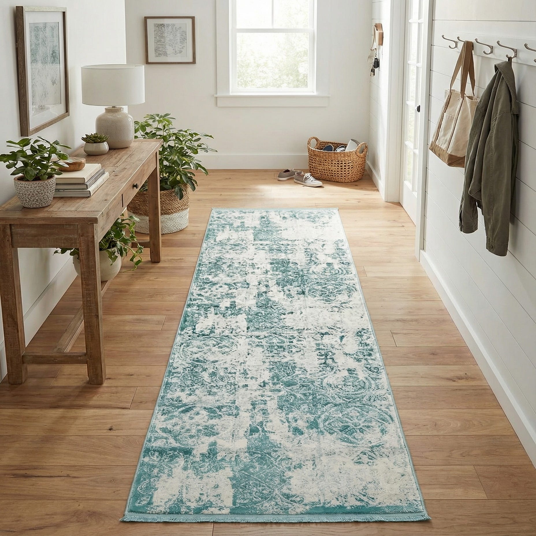Designed to bring subtle pattern and color without overwhelming a space, this runner works well in hallways, entryways, alongside a bed or down a narrow kitchen. Pair it with light wood floors and neutral furnishings for a calm, coastal-leaning palette, or use it in transitional and modern farmhouse interiors to introduce classic motifs with a contemporary, lived-in feel.