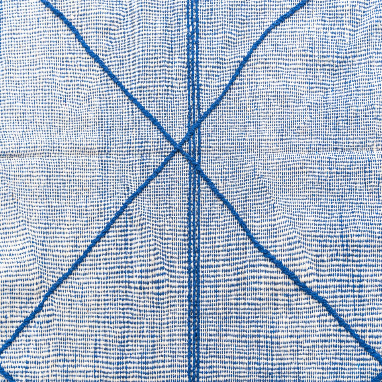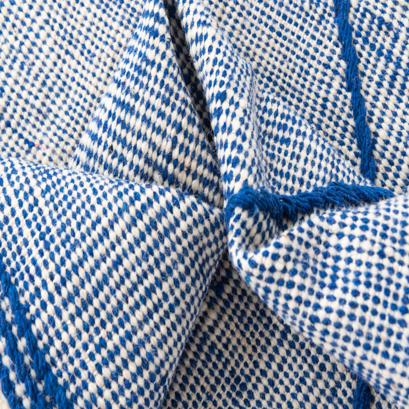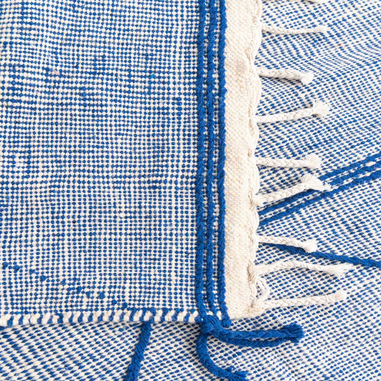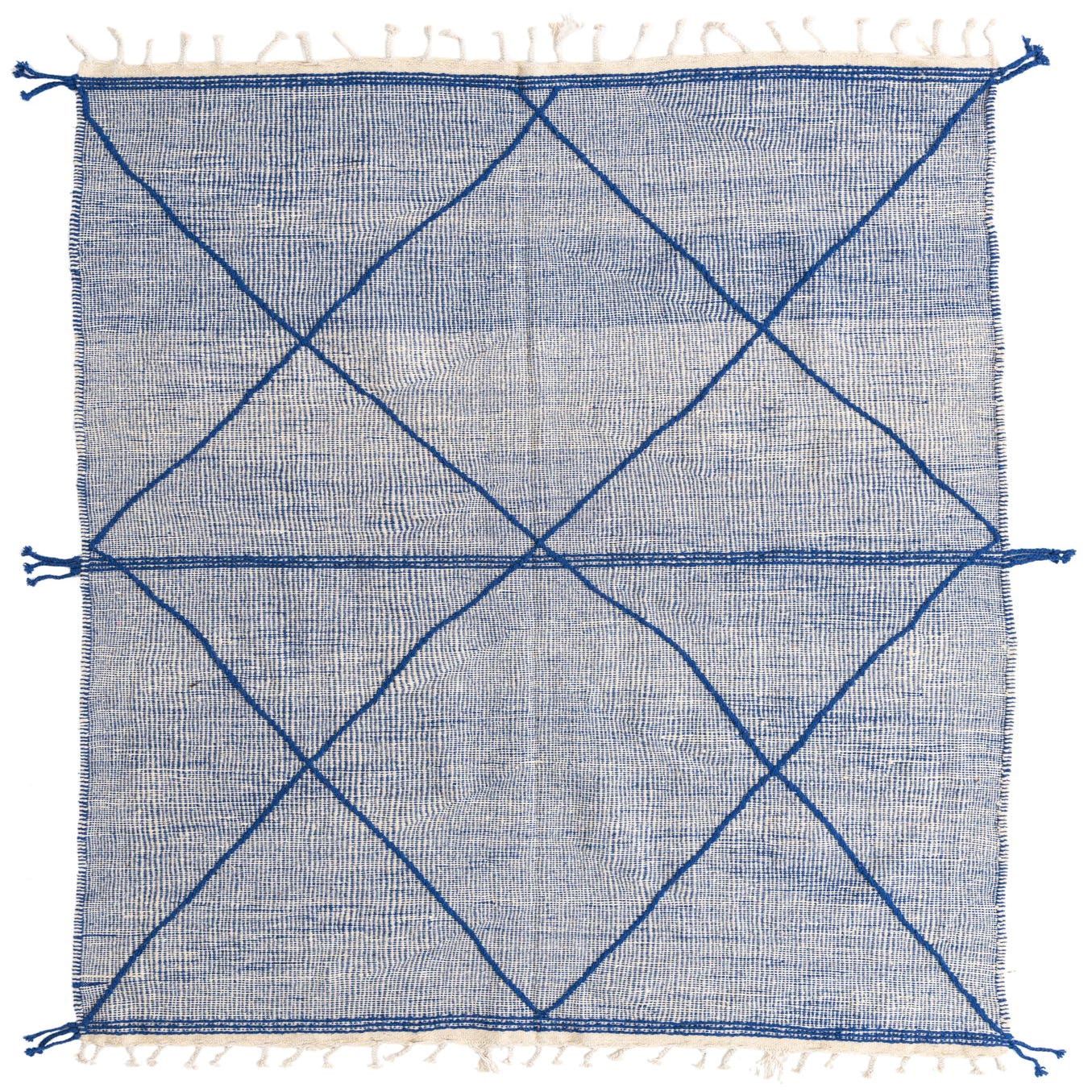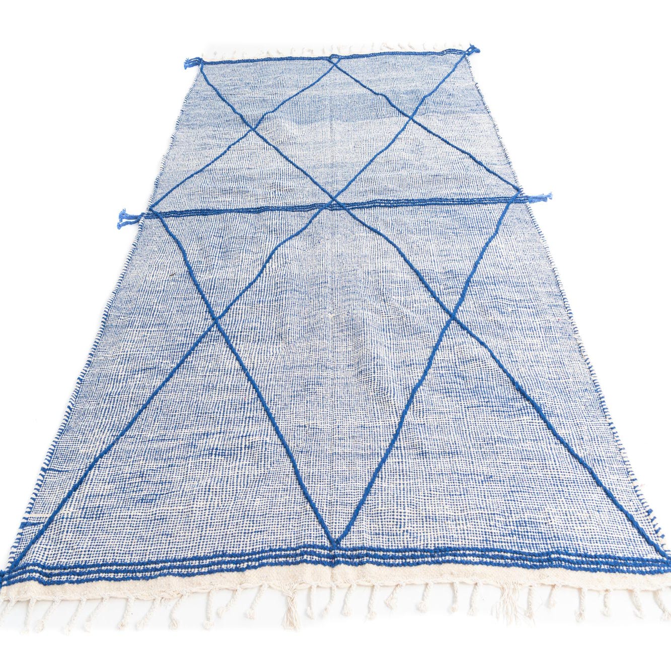 Hand-knotted from 100% wool, this runner presents a soft, tactile surface with a lightly textured hand and subtle variations in the weave. The background is a cool blue woven with ivory threads that give the field a slightly heathered, lived-in look, while bold blue lines form an oversized diamond lattice across the length. Short fringes at the ends and the visible stitchwork along the edges add a handmade character that complements the rug’s straightforward geometric style.