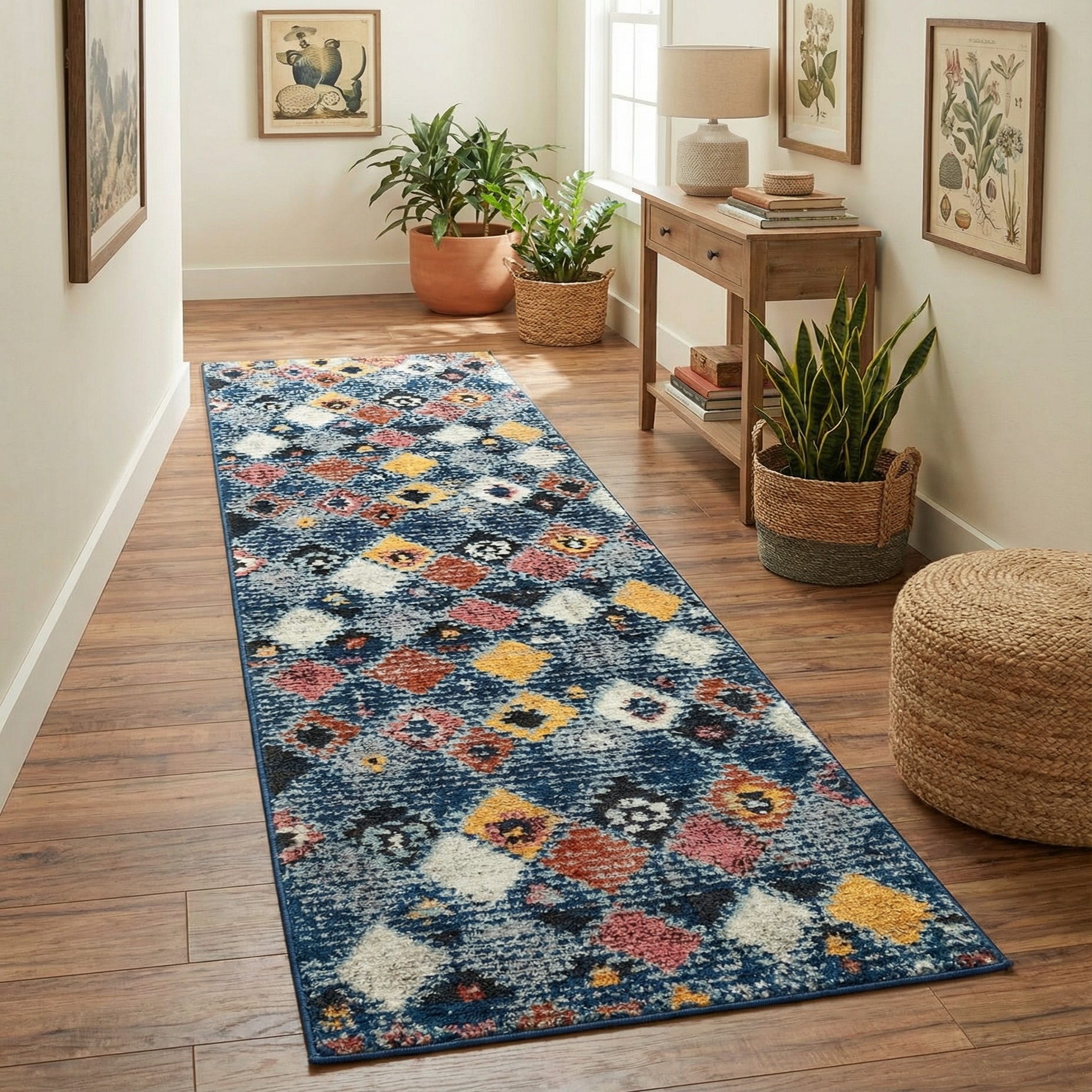 This long, narrow runner is well-suited to hallways and entryways or placed along the side of a bed or kitchen aisle to introduce color and pattern without overwhelming the room. It pairs naturally with warm wood tones, navy or denim upholstery, and neutral linens, and can anchor eclectic, bohemian, or transitional interiors where a mix of color and texture is desired.