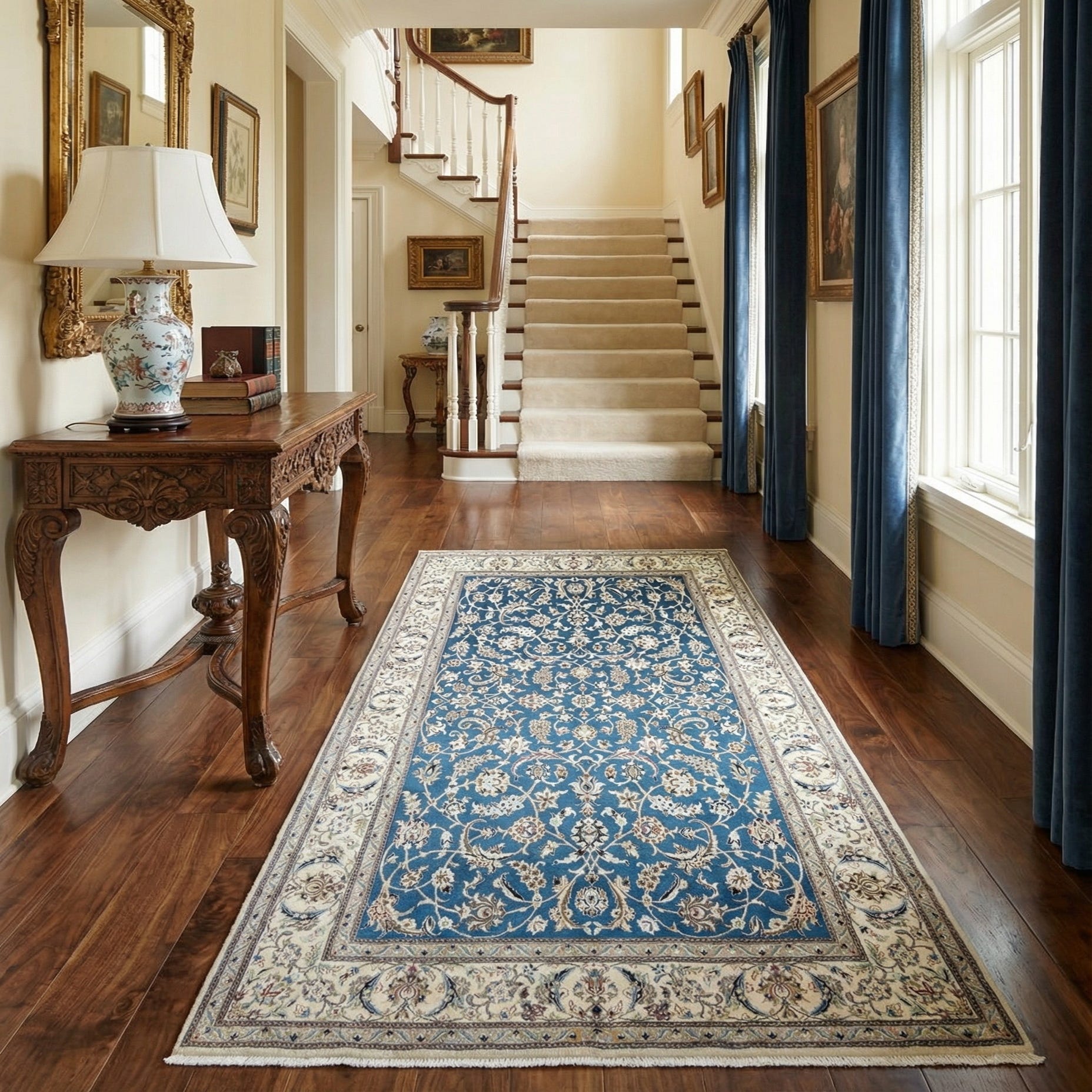The Nain Collection 10 Ft Runner is a handcrafted woolen piece that presents a sophisticated palette of blue, cream, brown, and dark blue. The background is a rich blue, which sets a tranquil tone for the intricate floral and vine patterns that grace the surface, reminiscent of classic Persian designs. The rug's edges are framed with an elaborate cream border that contains complementary motifs, echoing the richness and detail of the central pattern.