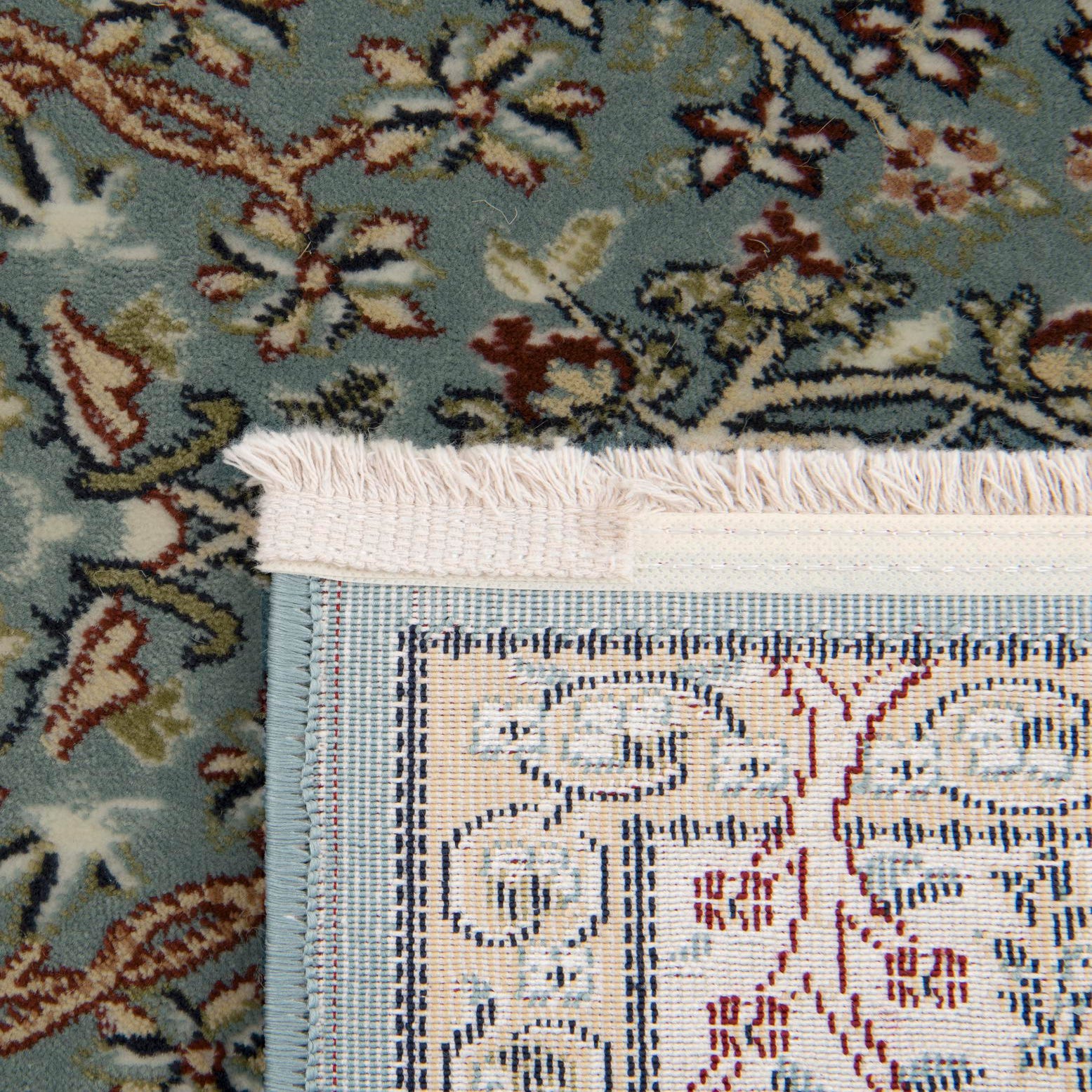 This runner presents a classic Persian-inspired layout with a central, symmetrical floral field framed by a narrow, ornate border. The blue background sets a calm foundation while accents of beige, cream and ivory trace vinework, palmettes and small rosettes; touches of burgundy, navy blue, green and puce add depth to the floral detailing. The pattern reads precise and finely scaled, and the machine-made construction (85% polypropylene, 15% polyester) produces a smooth, low-profile pile with a soft hand and a subtle sheen that keeps the motifs well-defined underfoot.