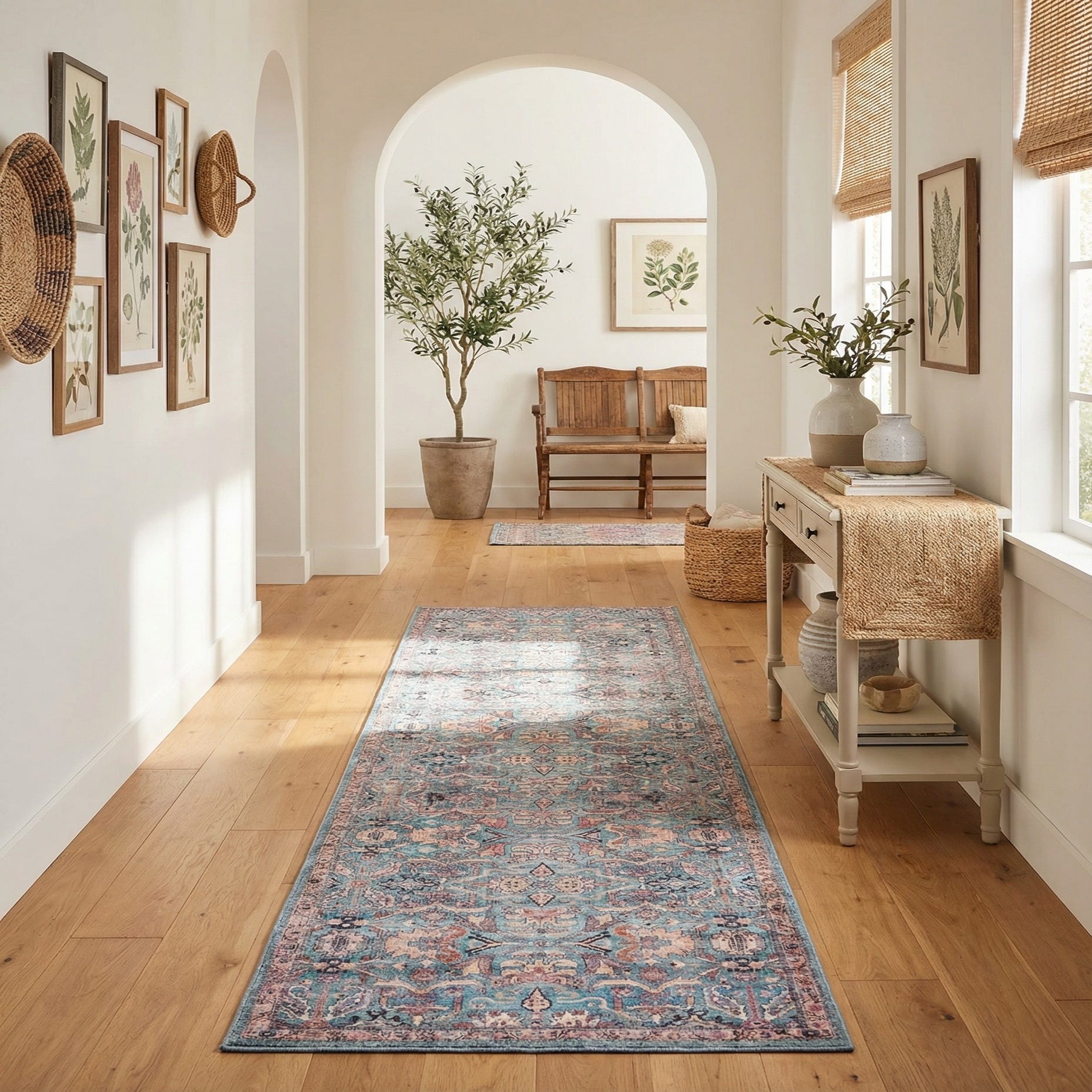 This runner works well in narrow and transitional spaces—place it in a hallway or foyer to guide the eye, alongside a bed to add warmth, or down a kitchen aisle to introduce color and pattern. It pairs nicely with warm wood floors, painted white or gray millwork, and furnishings in neutral or navy palettes, and complements casual coastal, cottage, and transitional-traditional interiors where layered texture and soft color play are desired.