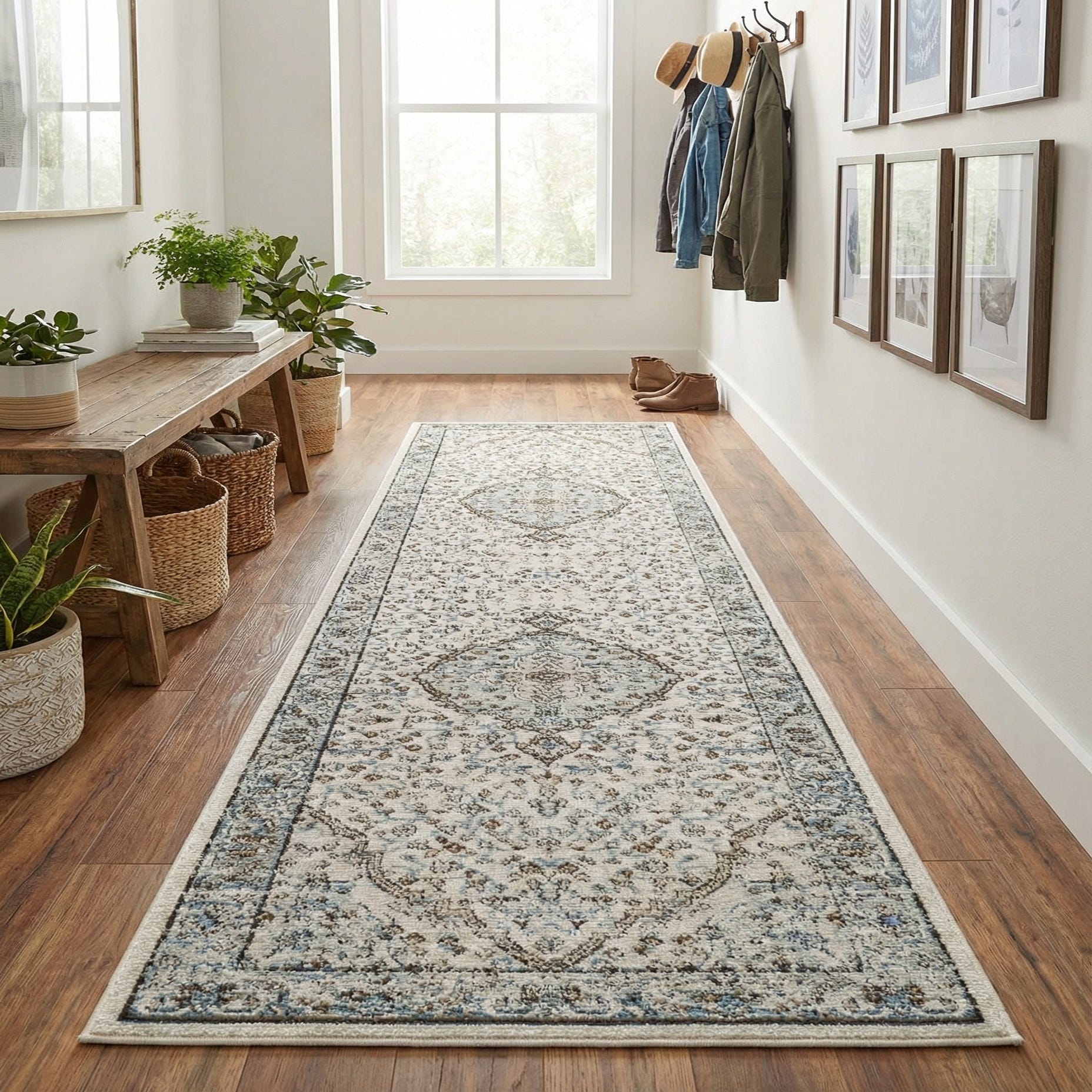 Primary color is Blue. Colors in this rug include: Blue, Brown, Ivory, Gray.