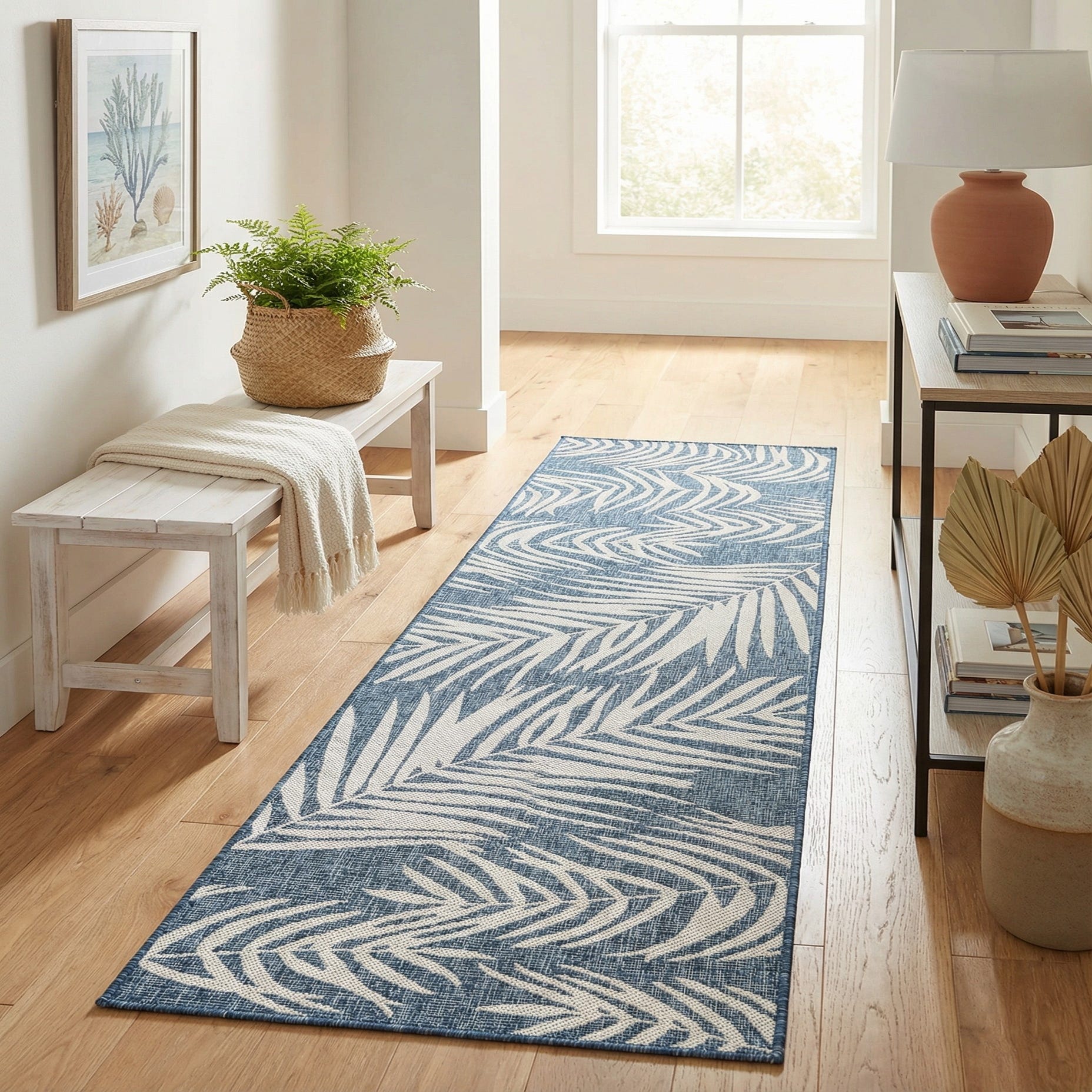 A 10 ft runner rug featuring a modern botanical pattern with large white palm fronds on a textured blue background.
