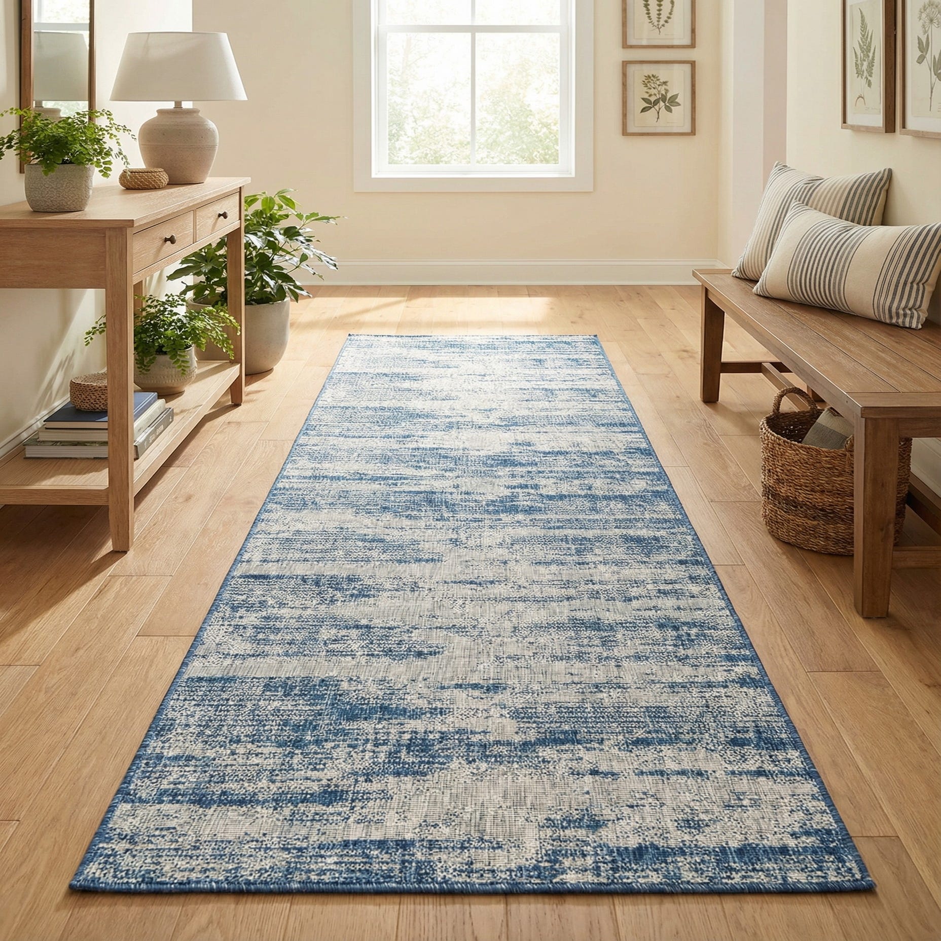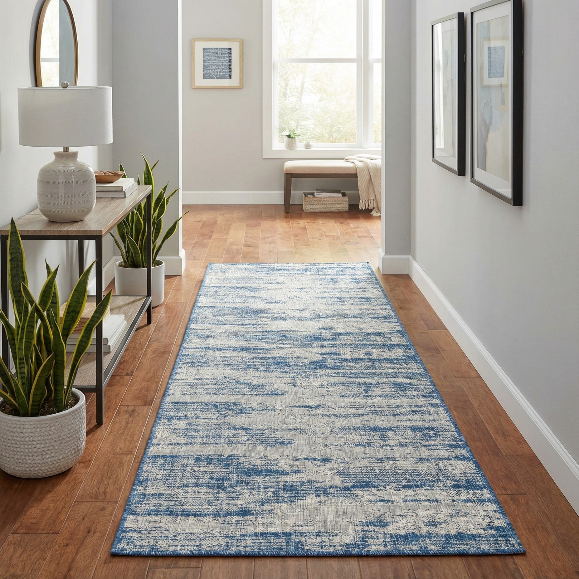 A 10 ft runner rug in shades of blue and white, featuring a distressed, textured flatweave pattern, suitable for a hallway or patio.