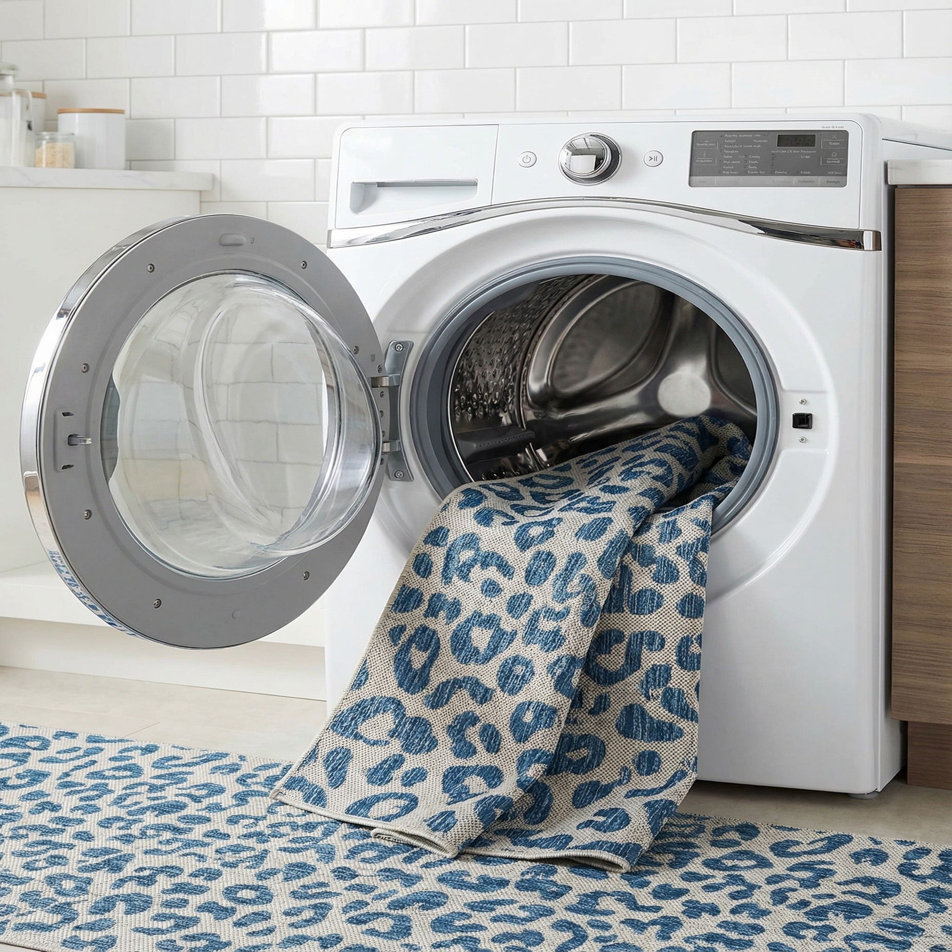 A 10 ft runner rug with a modern blue leopard print pattern on a light background, suitable for a hallway or patio.