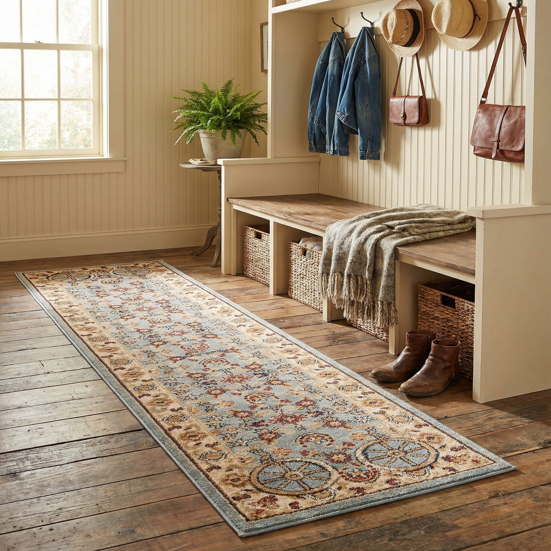 This runner works well in hallways, entryways, and narrow kitchen aisles where you want a classic look without overwhelming the space. Pair it with warm wood floors and painted furniture for a traditional or farmhouse vibe, or use it to introduce color and pattern in a transitional hallway or layered entry setup.