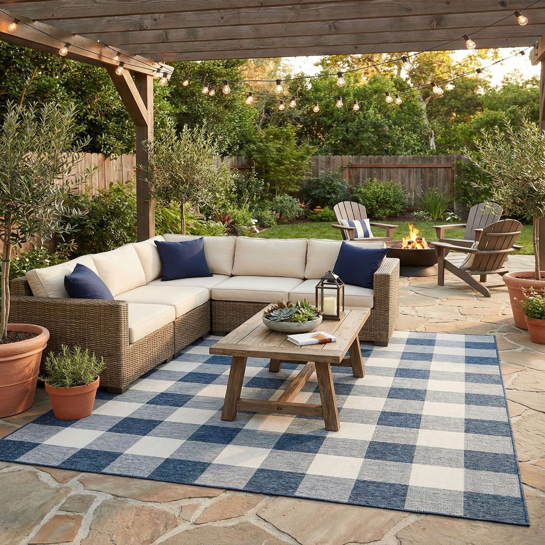 A 10'x10' square blue and white checkered indoor/outdoor rug with a flatweave texture, perfect for a patio.