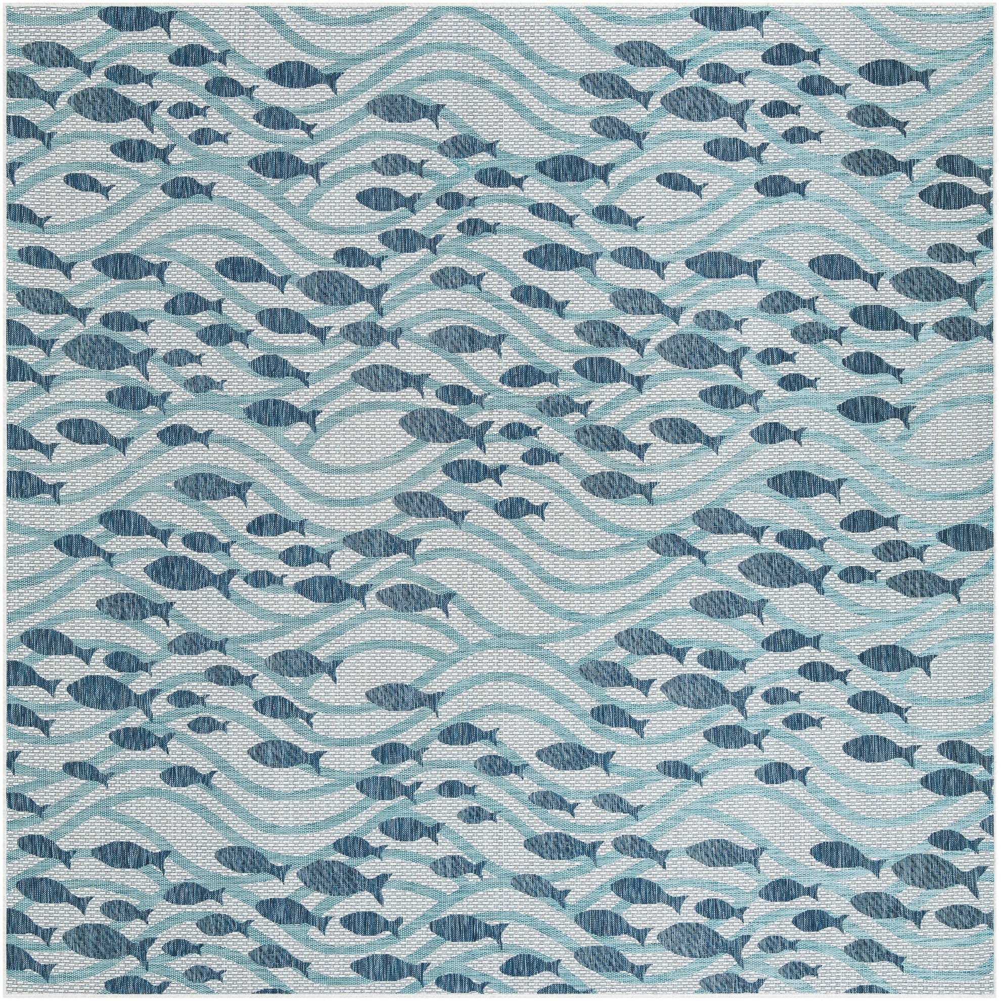 A 10'x10' square blue coastal rug with a playful pattern of dark blue fish swimming amidst light blue waves, perfect for a patio.