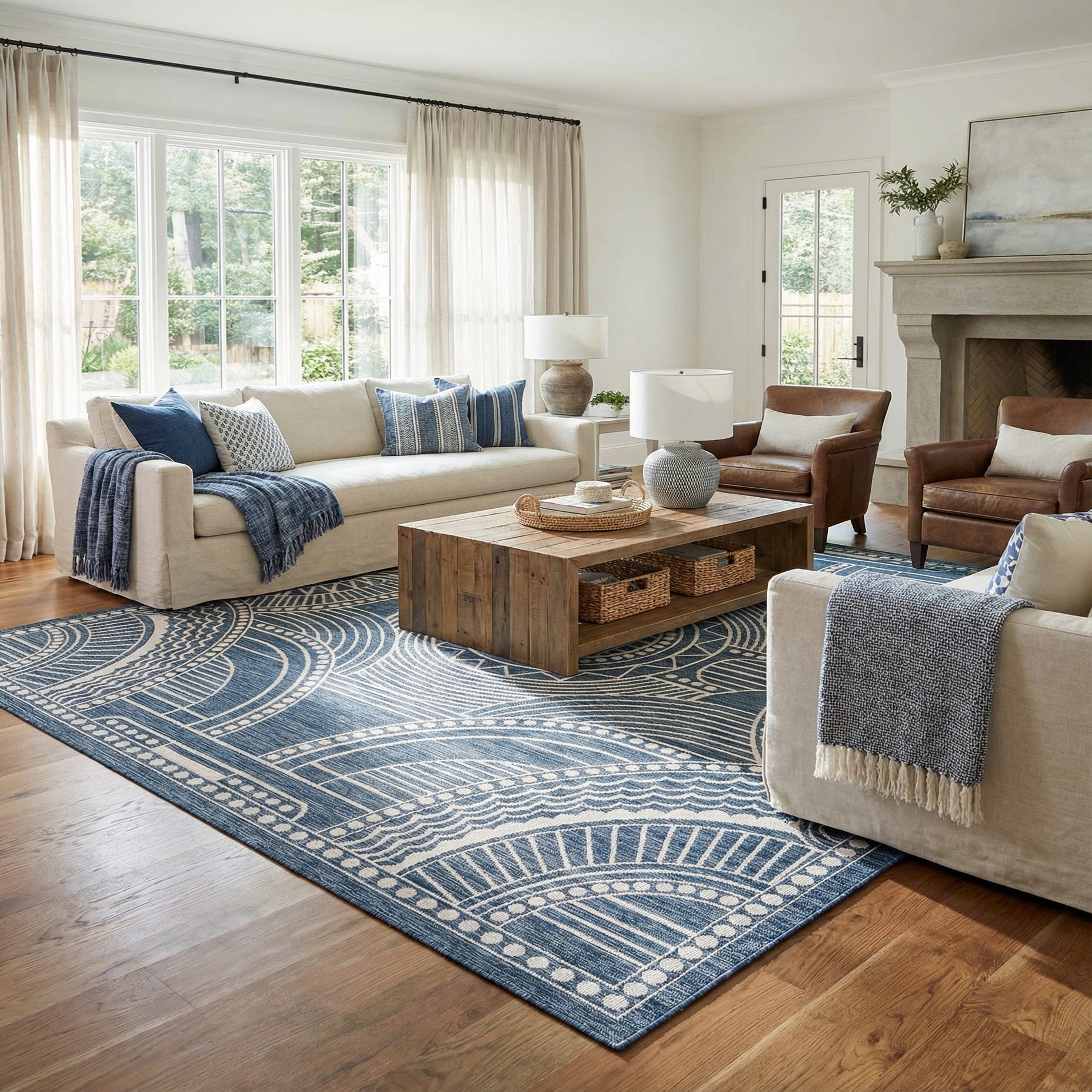 A bold geometric motif of concentric circles, scalloped arcs and dotted trims sits against a deep blue ground, with crisp ivory lines that define every element. The pattern blends traditional symmetry with a slightly modern, graphic sensibility — rows of fine linear texture run through the blue field, giving the surface a subtle striated look. Machine-made from 100% polypropylene, the rug has a low, tightly woven pile you can feel underfoot: smooth with a faint raised texture where the ivory design is rendered, offering visual depth without bulk.
