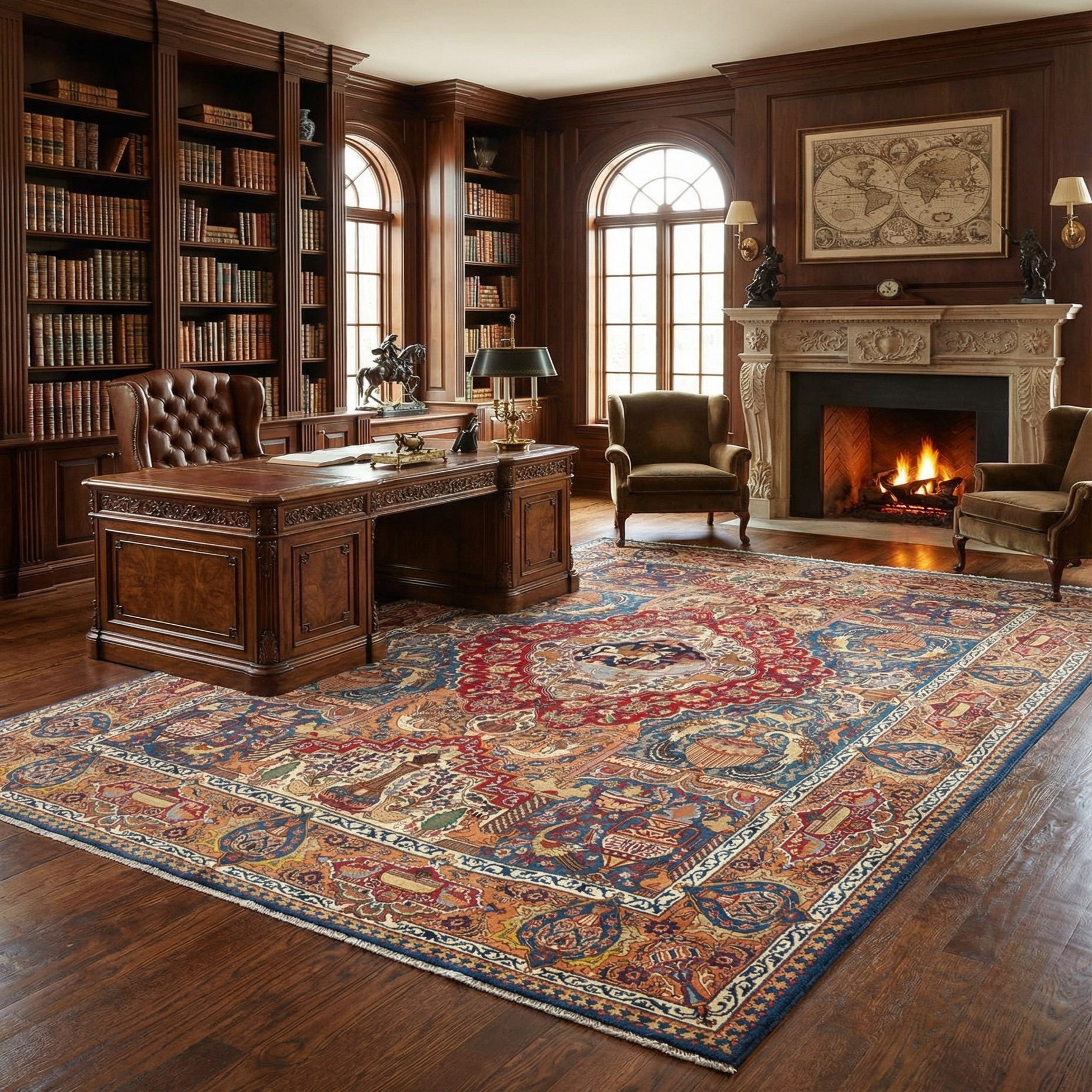 This Kashmar rug would be well-suited for placement in spacious living areas, formal dining rooms, or grand entryways where its elaborate design can be displayed to full effect. In decor scenarios that favor classic, Victorian, or traditional furnishings, this rug will blend seamlessly, while in more contemporary settings, it can serve as an eye-catching contrast to minimalist elements.