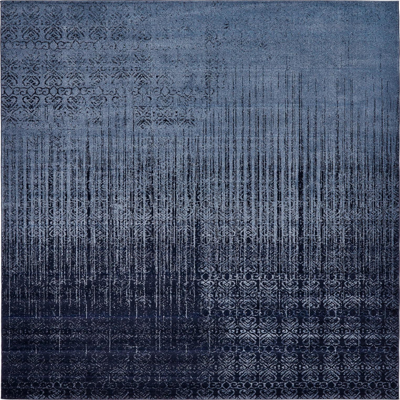 A tonal blue background sets a calming stage for a modern take on vintage ornamentation. Vertical, rain-like streaks cascade into a denser band of navy-blue medallion and lattice motifs, creating an ombré effect that feels both structured and relaxed. The pattern reads as a contemporary, distressed interpretation of classic trellis and floral elements, giving the rug a layered, lived-in appearance without overwhelming a room.