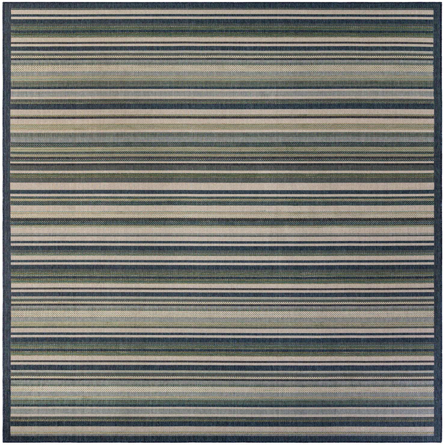 A clean, horizontal stripe layout gives this rug a relaxed, contemporary look. Bands of ivory, light brown, olive and navy blue run across a blue background, with varied stripe widths and subtle woven patterning that create visual texture without busying the design. A narrow navy border frames the piece, reinforcing the linear motif and giving the rug a finished, tailored appearance that suits casual and modern interiors alike.