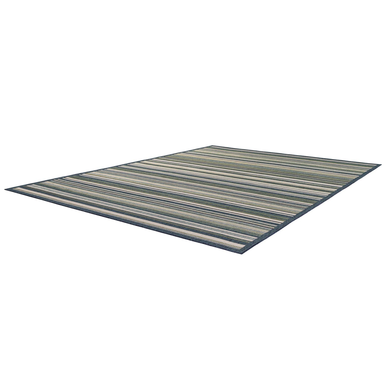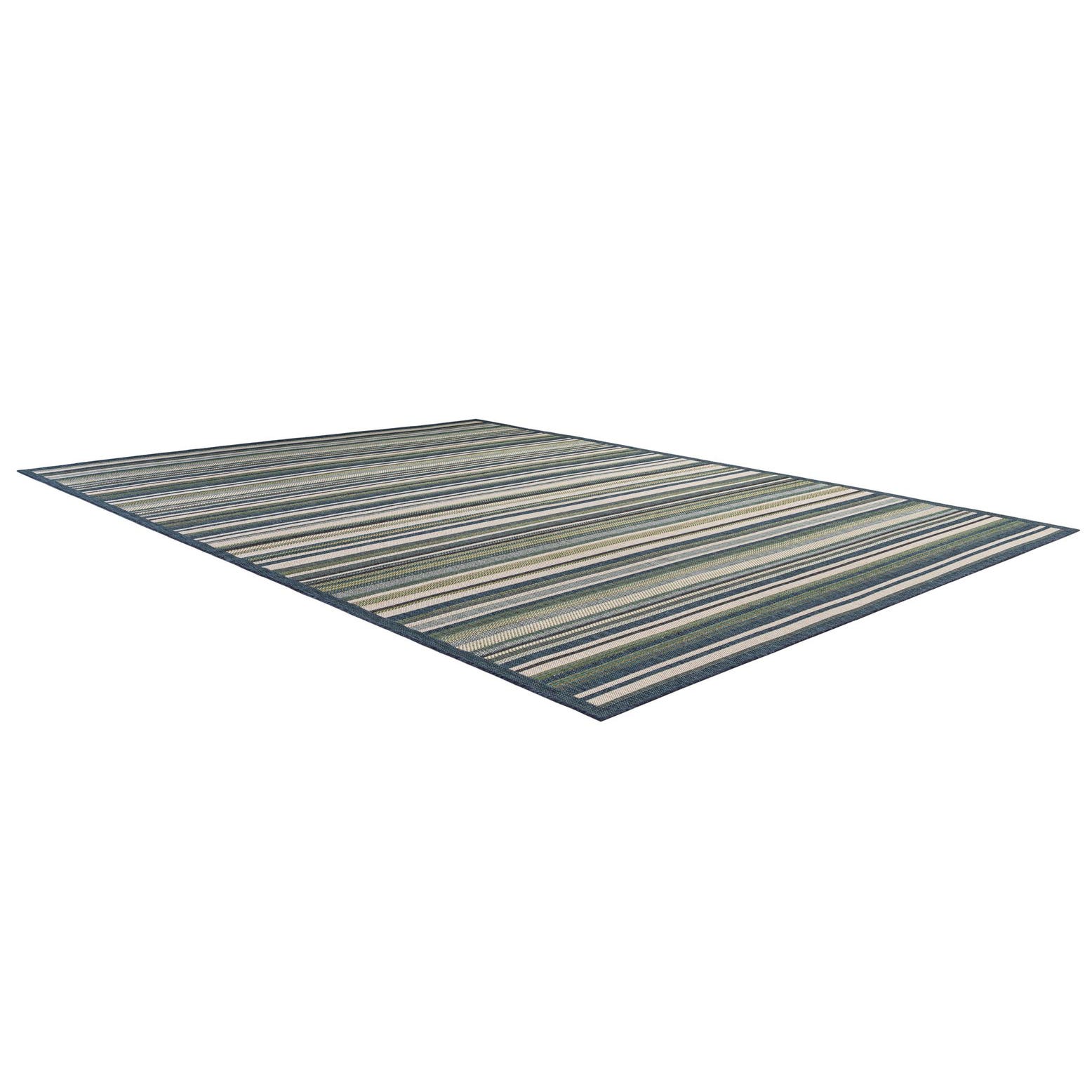 A 10x13 rectangular Baja Outdoor rug featuring modern blue, green, and beige stripes, suitable for indoor or outdoor spaces.