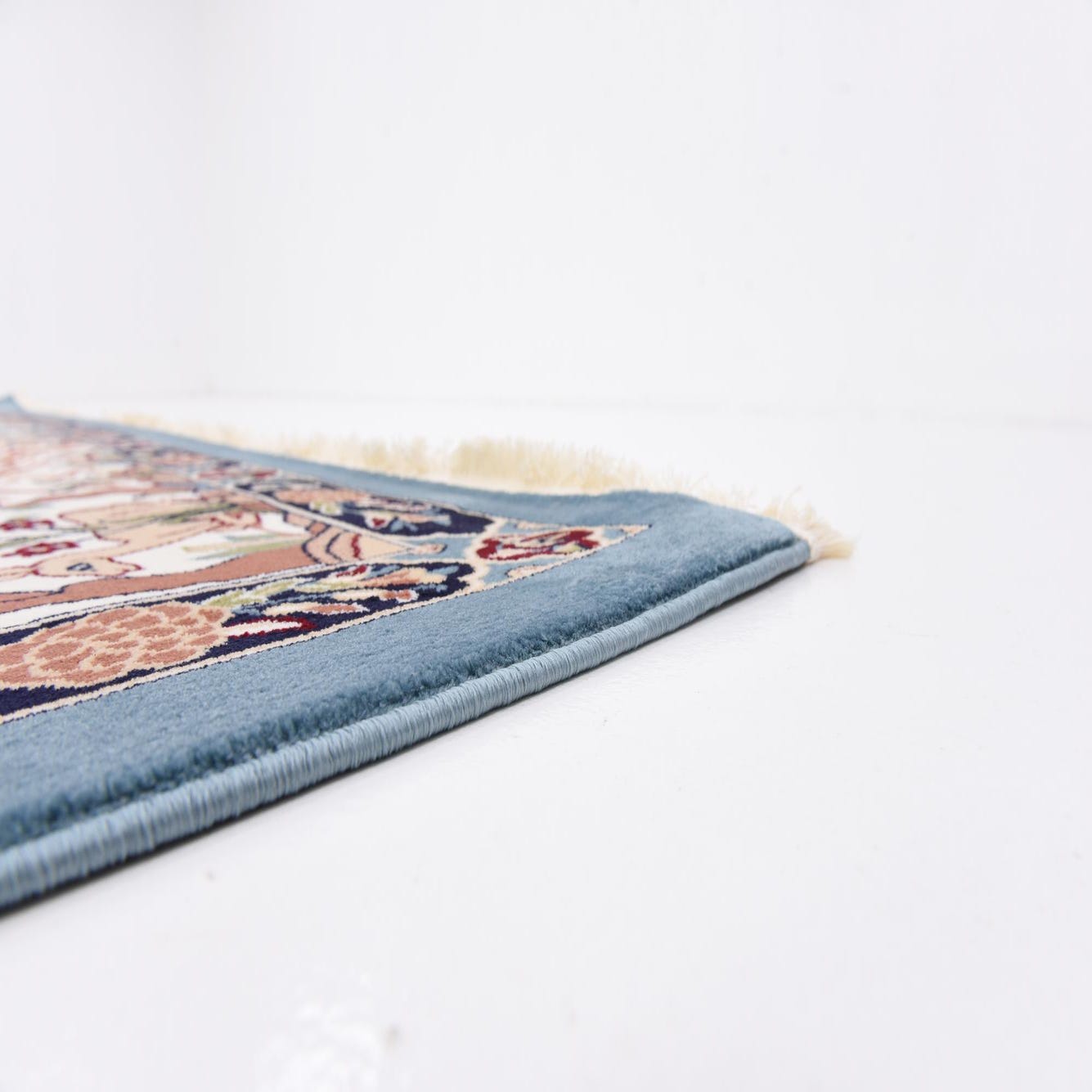 Primary color is Blue. Colors in this rug include: Blue, Black, Burgundy, Cream, Green, Ivory, Navy Blue, Plum Red, Tan.