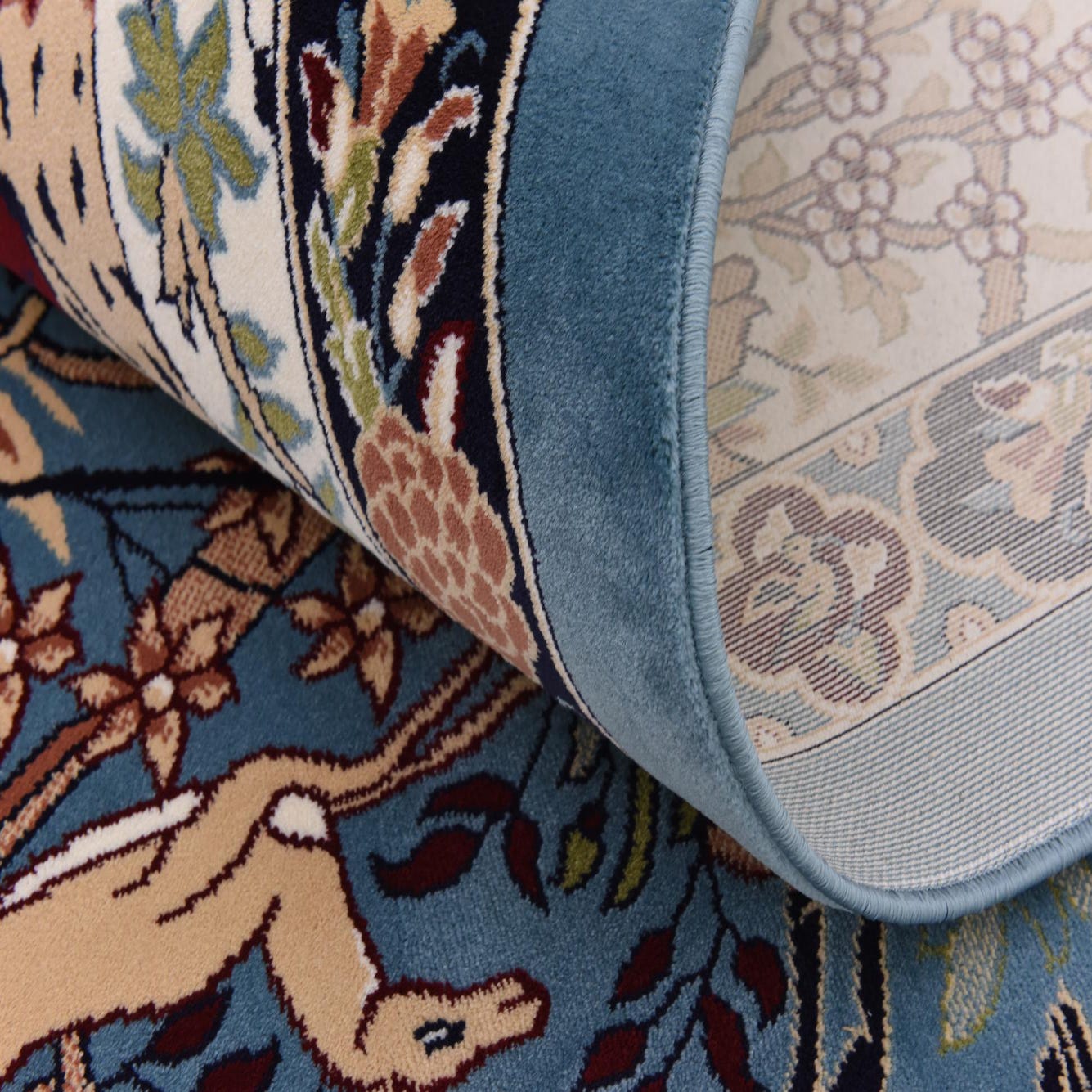 The Nain Design rug, sized at a substantial 10x13, is an impressively scaled piece that showcases a classic pattern with a deep blue backdrop. The design features an intricate array of botanical and ornamental motifs, interwoven with animals throughout its expanse, rendered in harmonizing shades of blue, black, burgundy, cream, green, ivory, navy blue, plum red, and tan. This sophisticated color palette grants the rug the versatility to integrate seamlessly into various decor styles, from traditional to more contemporary settings.