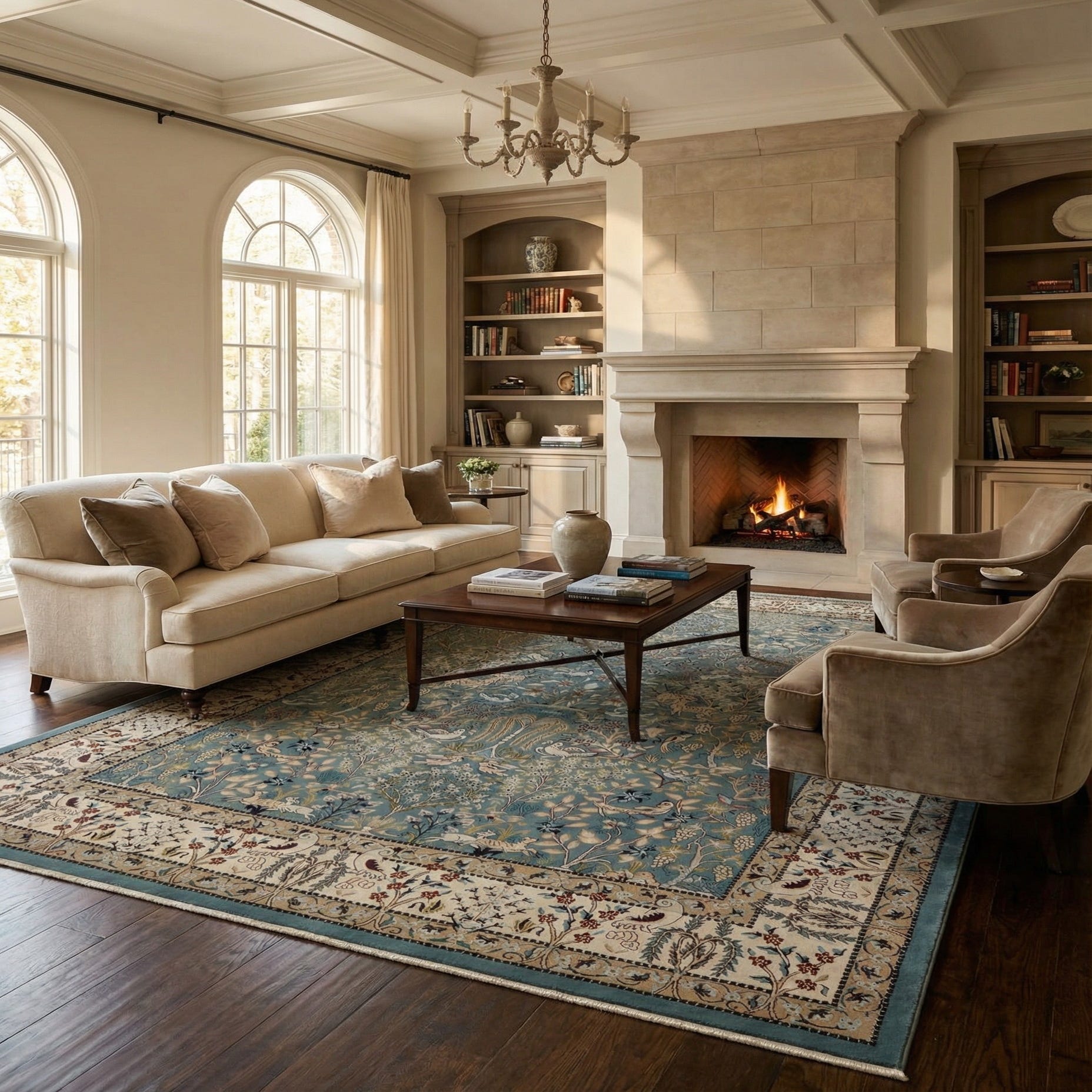 Place this rug to anchor a formal living room or dining area where the pattern can be appreciated beneath seating or a large table. It pairs well with warm wood furniture, cream or navy upholstery, and brass or antique finishes, and can also introduce classic pattern and color into a transitional or coastal-inspired space. Use layered with solid throws and cushions in navy, ivory or puce to echo the rug’s accents and create a cohesive, inviting scheme.