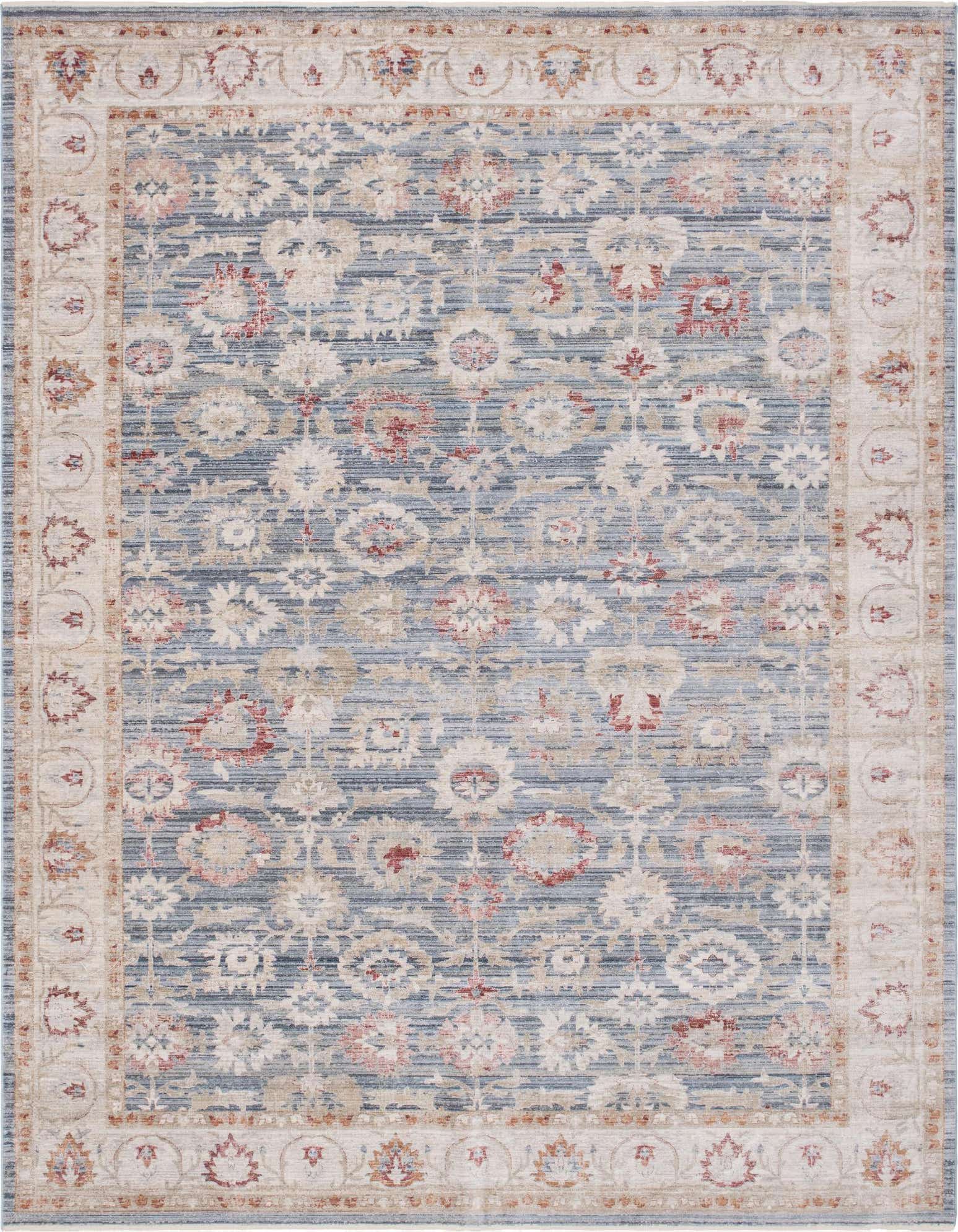 The rug is designed to be stain-resistant and shed-free, making it a practical choice for high-traffic areas. Its substantial size and impactful design make it suitable as a statement piece in spacious rooms such as living areas, dining rooms, and master bedrooms. The traditional pattern of the rug would sit comfortably in classic interiors, yet its vibrant color scheme could also provide a striking contrast in more contemporary or transitional spaces. This rug can serve as a unifying element in a room with neutral tones or as an anchor for decor that features gold or blue accents.