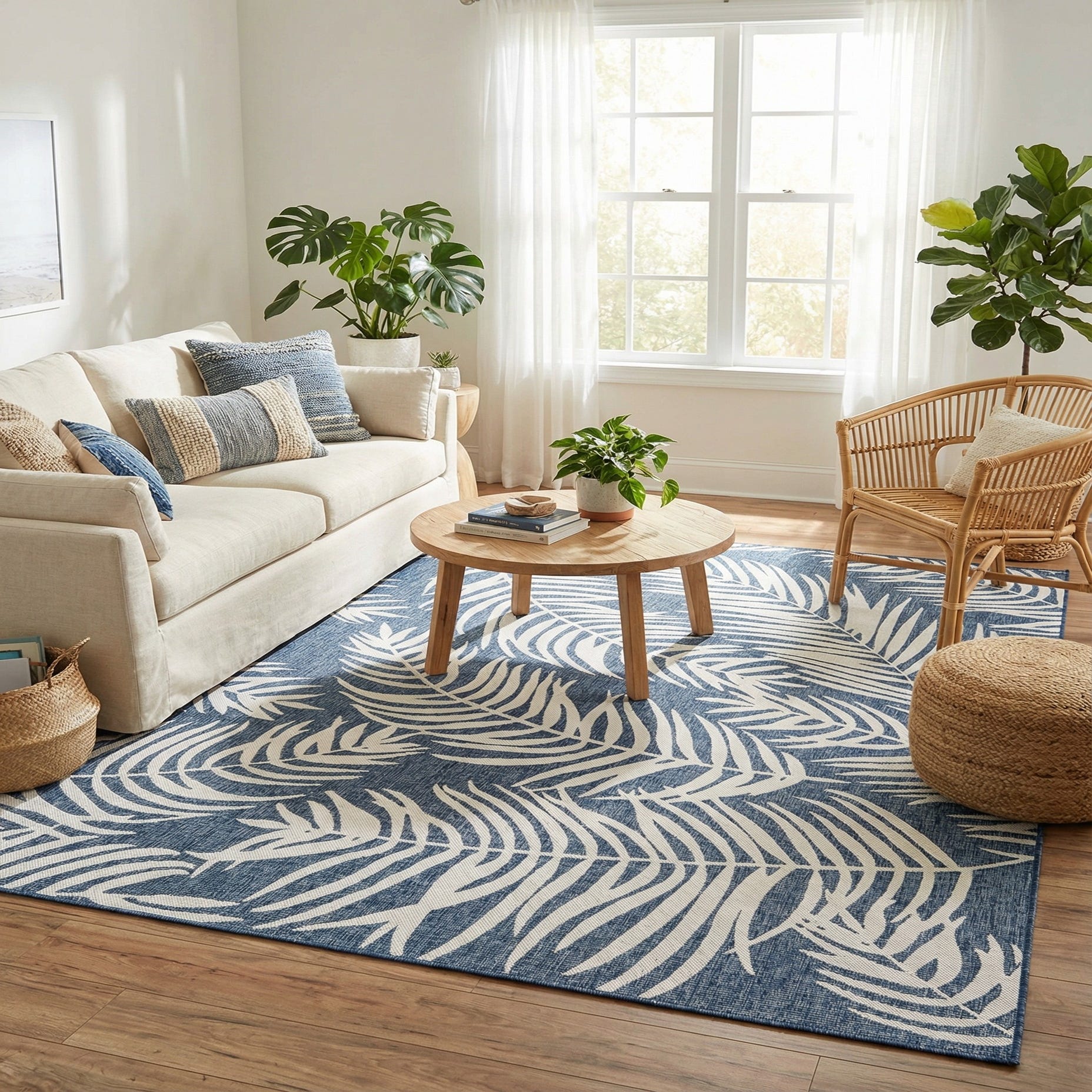 The Outdoor Botanical collection presents a 10x13 rug that displays a dynamic botanical pattern, comprising fluid leaf-like motifs that create a sense of movement across the surface. The design features a vibrant contrast between the blue background and the ivory patterns, offering both a visual and textural interest.