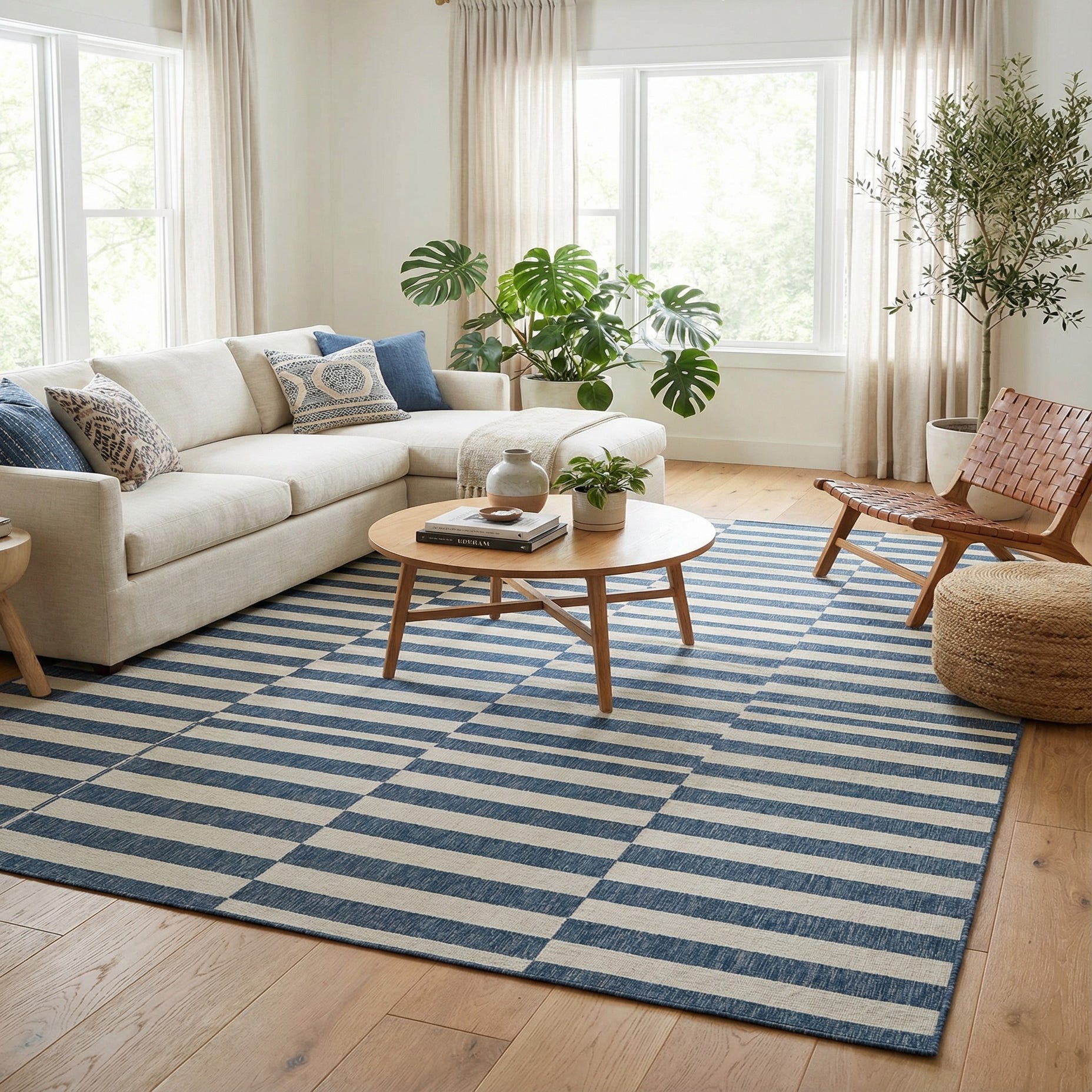 This rug fits well in both covered outdoor settings and indoor spaces that benefit from a fresh, coastal-modern look — think sunrooms, covered patios, casual dining areas, or a living room with crisp, airy furnishings. Pair it with natural woods or wicker, linen upholstery, navy accent pillows, and warm-metal finishes to reinforce the clean, striped geometry and bring a relaxed, pulled-together feel to the room.